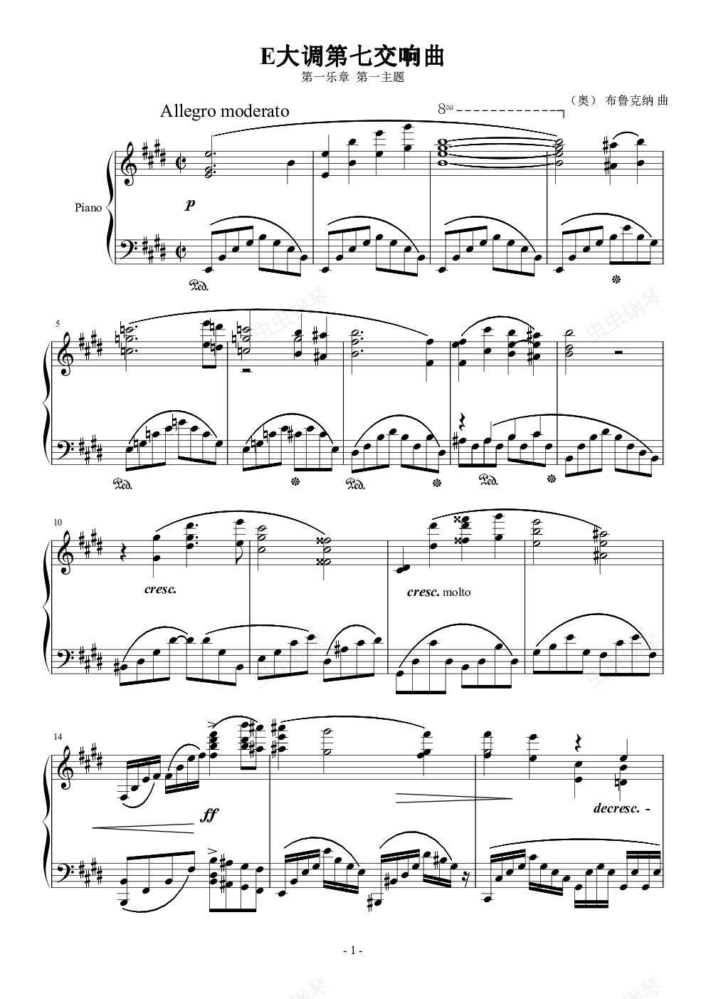 钢琴谱:布鲁克纳 E大调第七交响曲 第一乐章 第一主题