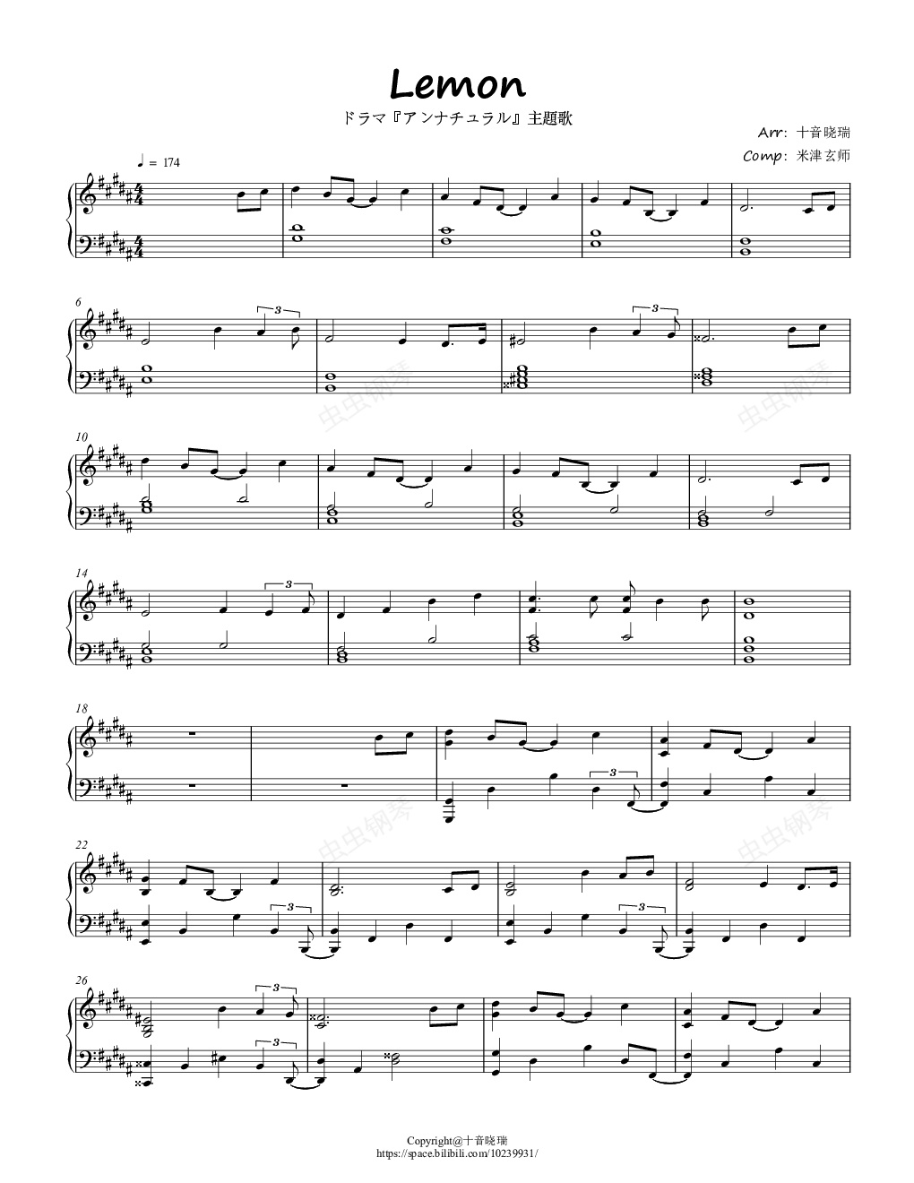 钢琴谱:《Lemon》(「Unnatural」主题歌)