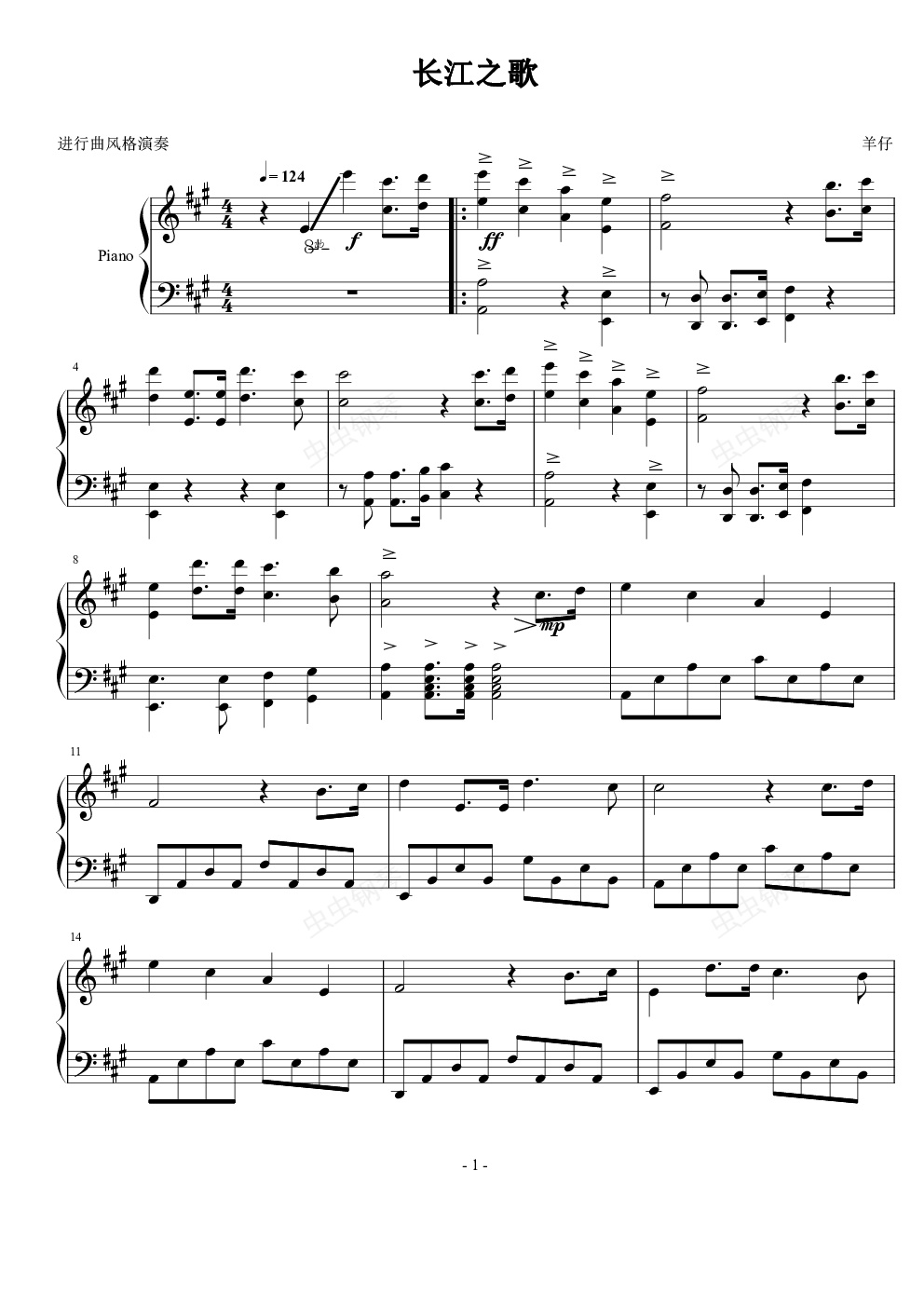 钢琴谱:长江之歌 A大调版
