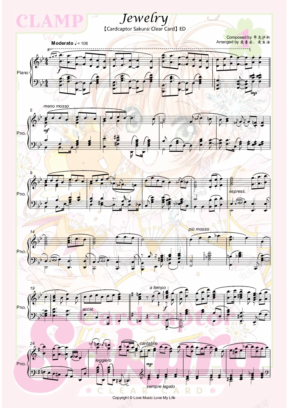 [IMG]/pu/2018/2/24/__6415_17757_[/IMG]一月新番 【魔卡少女小樱 Clear Card篇】ED。依旧是自己弹试听。但是这次好像写的难了,而且根本没怎么有时间练,录的时候都快崩溃了。。效果么也只能这样了。。。----------------------------------------------------------- 以下是作者本人对本次编配的一些话 -----------------------------------------------------------这次稍微融入了一点轻微的爵士进去,更符合原曲的感觉,当然这也使得曲子的难度一下子就上去了,而且跨度也比较大,各位想练的朋友做好心理准备。。。此外,在第26 - 28 小节,高音部分旋律故意和左手伴奏部分节拍错开一个八分音符的时值,不但让人练起来抓狂,而且在音效上也没什么太大的效果。。(其实还是有一点的。。。)----------------------------------------------------------- 以下是作者个人生活的一些情况 -----------------------------------------------------------如果你不想看的话,就忽略这些文字好了。如果你特别好奇的话,也可以忽略这些文字。以后编曲子的机会可能就几乎没有了,因为我今年暑假就要去美国UM读我的双学位。。。要读两年。。离开了家里便利的环境,再加上学业上的负担,肯定是抽不出时间的啦。所以这也是我为什么现在要赶工多做几份谱子,而且试听都力求自己演奏的原因啦。要是以后看见我偶尔诈尸的话,还请大家多多关照一下。最后再贴张小樱的照片(* 1 ▽ 1 *)[IMG]/pu/2018/2/24/__6415__[/IMG][IMG]/pu/2018/2/24/__6415_17152_[/IMG]