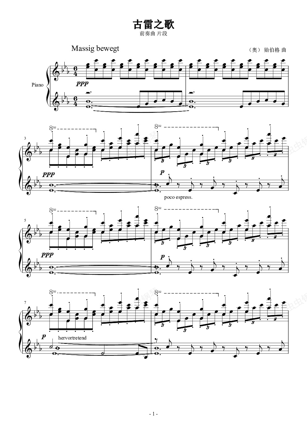 《古雷之歌》()是奥地利作曲家勋伯格的大型清唱剧音乐作品,本作品需要动用5位独唱家及1位朗诵旁白者,再加上三队男声合唱团、一队混声合唱团及编制十分庞大的管弦乐团,由1900年起开始构思,断断续续的规划及动笔,直至1911年11月才正式完成。乐曲依据丹麦作家雅各生(Jens Peter)于1868年创作,但直至他逝世时亦未完成的诗集《盛开的仙人掌花》(En ud)中的《古雷之歌》而获得灵感(),勋伯格依据由罗拔·亚诺所翻译的德文译本,把诗歌内容放进音乐内。此钢琴谱由勋伯格的弟子贝尔格改编。这里选取了开头一段。