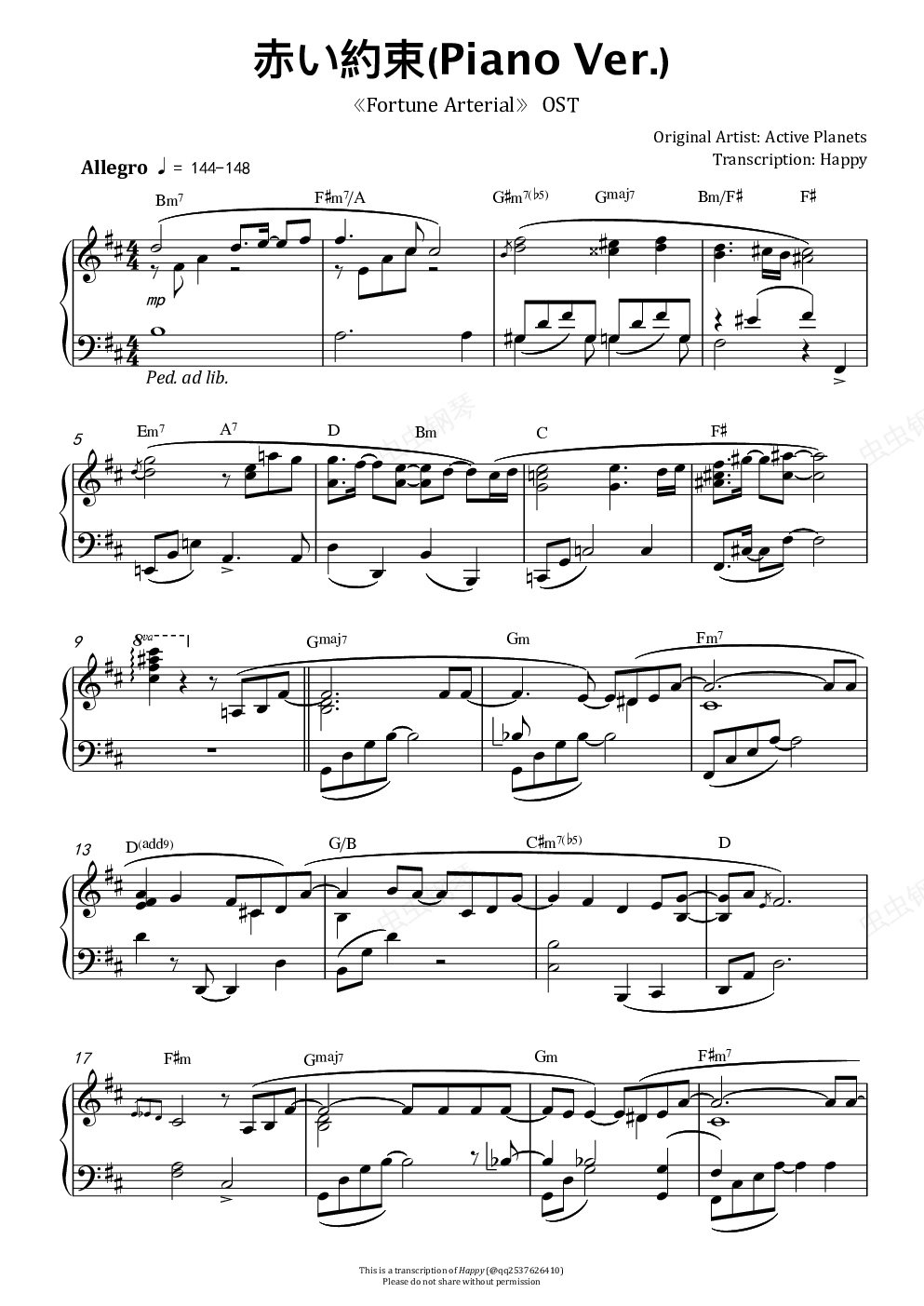 [IMG]/pu/2018/3/3/__4261_23541_[/IMG]比较认真地扒了一次谱。。。嘛,我扒的第二首的曲,比那首<月夜に舞う恋の花>要简单不少。到暑假之前以扒谱以及编配为主,因为五月底就要高中毕业考试了,得抽出时间复习演奏注释:1.本曲整体上感觉偏即兴,钢琴有一定水平的人八成能比这个“即兴”得更好,因此我把主要的和弦标上了。2.音乐术语上没有标注太多,考虑到原曲在强弱对比以及声部上已经有一定处理,可以听试听按照试听的感觉弹。虽说如此,但我觉得这首曲子的演奏完全可以更自由地处理,看你们的喜好了。。。P.S. 我的大号(コナユキ)什么时候能找回来啊。。。进行申诉显示页面不存在。。。这半年多写的原创曲我都没敢发上来(除了参赛的那两首,虽然写的不是很满意)