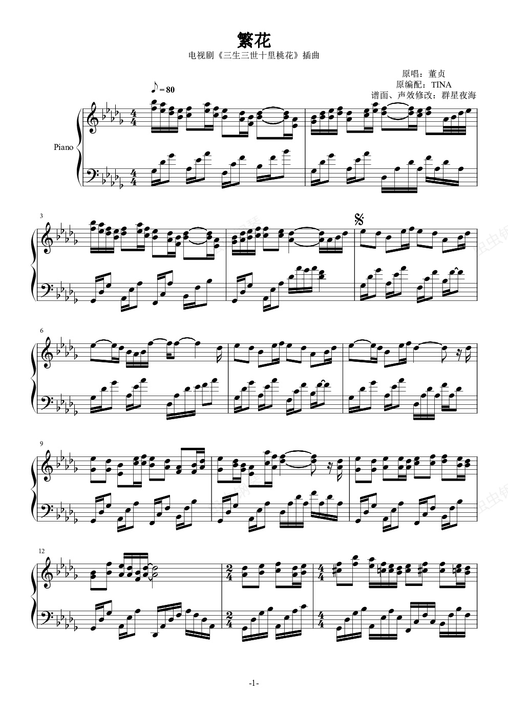 钢琴谱:繁花(完整版)- 《三生三世十里桃花》插曲