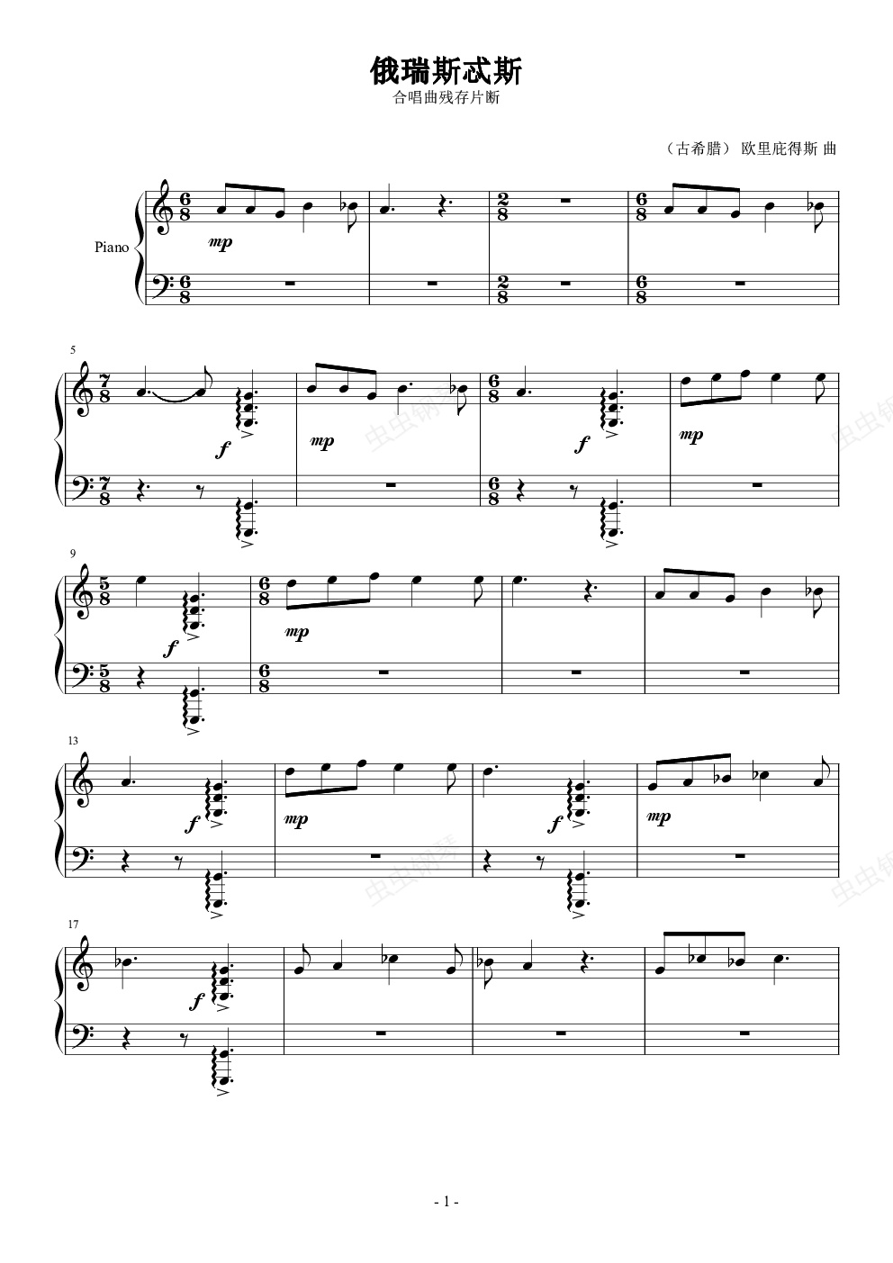 . 古希腊音乐。欧里庇德斯(公元前480年--前406年)的戏剧《俄瑞斯忒斯》()中的合唱曲残存片断。根据西班牙音乐学家帕尼瓜指挥马德里音乐中庭古乐团演奏的古希腊音乐专辑扒谱。留存至今的音乐资料显然要比那个璀璨文明时代的古希腊建筑要少的多。虽然部分阐述古希腊音乐理论的著作被保存下来了,但那个时期真正的音乐作品却只能从残存的蒲草纸,大理石柱等材料上窥得一斑。由帕尼瓜带领的马德里音乐中庭古乐团将这些残留的片段重组还原,并用经过改造的复古古希腊乐器演绎出来。其中有些乐器被沿用至今,比如风笛。专辑中的某些乐曲片段可能会让听众想起诸如格里高里圣咏这样的早期音乐,而其它的一些则与现有的任何音乐截然不同,肯定会令人称奇。一些音乐疏松飘逸,旋律发展缓慢,而另一些古代的打击乐器的音响效果却很像今天的电子音乐。