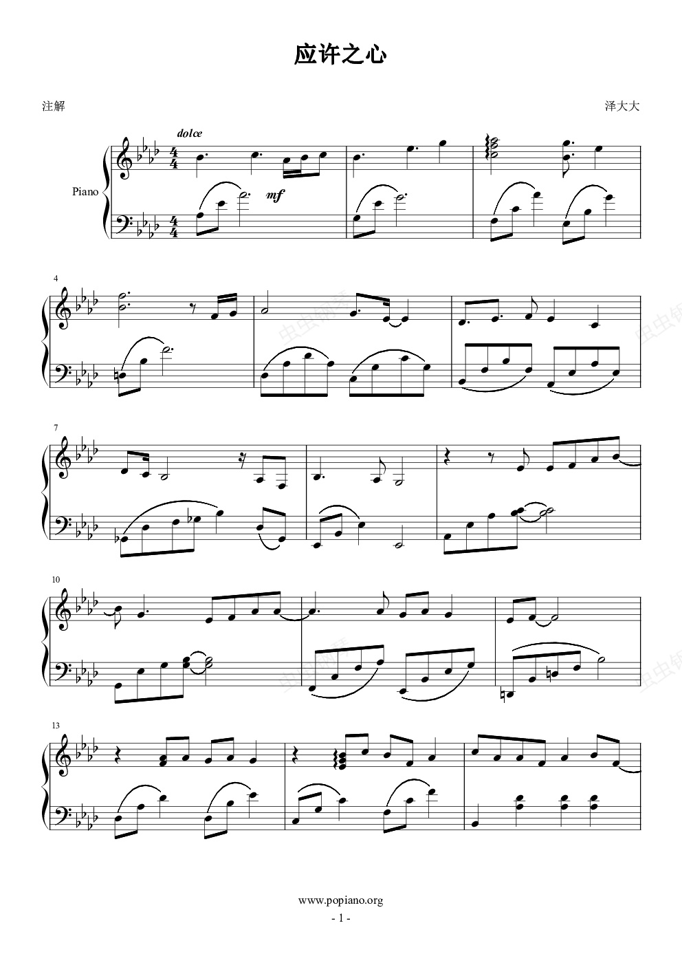 钢琴谱:应许之心(独奏)