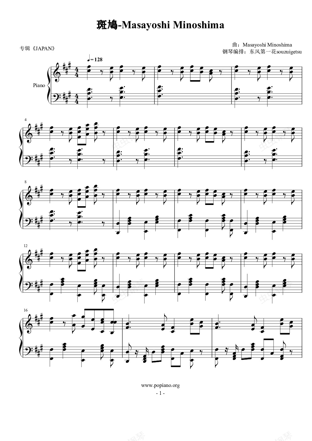 钢琴谱:斑鳩-Masayoshi Minoshima(斑鸠)(专辑:Japan)