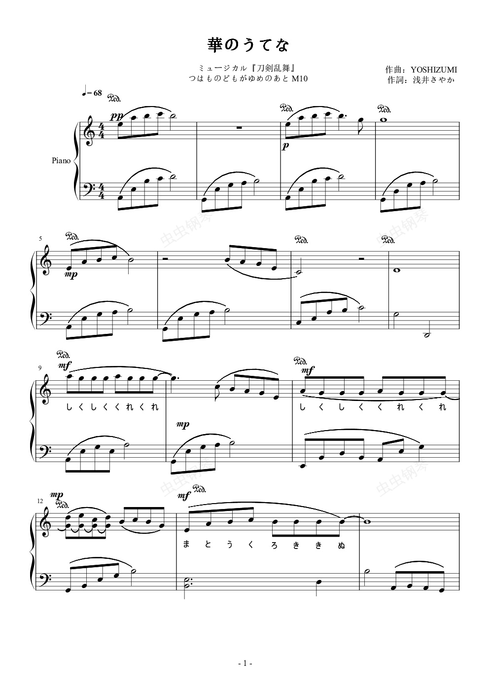 (泰 衡/ 蓮の花が…美しい。もし我が躯と出会うことがあれば、蓮の花を供えてくださらぬか)(三日月/ …約束しよう)(泰 衡/ ではーー今生の別れ!さらば!)(三日月/ 約束は守る…年寄りだからなぁ)しくしくくれくれしくしくくれくれ纏う黒き衣 泡沫の役目満ちては欠けてゆく玉桂半座分かつ 花の台誰が為にそこにある宿世分かつための 花の台-------------------------------------------------------------刀剑乱舞音乐剧第4作つはものどもがゆめのあと的剧中曲第10首,官网给出的准确名称是華のうてな2,与M9 華のうてな1对应并区分。歌词听写来自日站 //-------------------------------------------------------------其实原本是想两首编在一起的,毕竟是个整体,歌词意境也有对应:前一首的虚幻,后一首虚幻中的深重情感……前一首生而即逝的梦,后一首满而即缺的月……后一首的副歌部分也像是对前一首最后一句的解答。(上面网址有第一首的词)但是水平实在有限,两首的旋律虽然基本一致但是伴奏差太多了,以我这程度强行连起来会听着根本不像一首曲子……于是只选了比较完整的第二首。因为是听Live配信做的,音质问题加上个人能力有些地方实在听不清……但除副歌部分无法照搬以外基本还是尽量还原的。主歌4句错开八度一是为了有点变化不单调,二是“泡沫の役目”这句莫名觉得高8度会比较有虚无感……副歌编得多毁心里也是有数的,没想到bpm太低的曲子16分听起来的效果和想象差太多……也实在不知道怎么编才能有显得稍微饱满强烈一点了……还有个别句子那个……得过且过吧_(:з」∠)_水平的锅