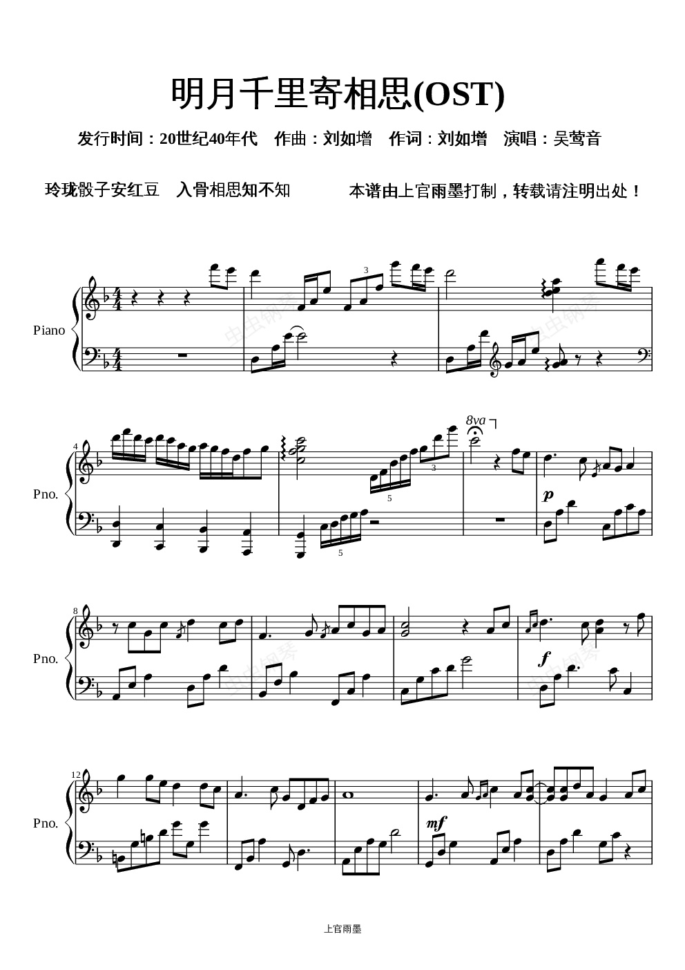 《明月千里寄相思》是一首经典的老歌,自上世纪40年代流行于上海,直到今天,仍然不断散发出青春活力。这首曲子完美抒发了对恋人的思念之情,“但愿人长久,千里共婵娟”的心境被体现地淋漓尽致。泰国电影《暹罗之恋》更是将这首曲子推到了一个新的境界。2008年央视中秋晚会,邀请了电影《暹罗之恋》的两位主演,再次将中国古人以月寄思的感情完美得展现在世人面前。并且同中秋主题紧紧相扣,央视的中秋晚会的这首曲子,收到了全社会广泛的好评,并且再次使《明月千里寄相思》这首老歌传遍中国,其历久弥新的内在诠释了“玲珑骰子安红豆,入骨相思知不知!”的心灵中的深深思念。本谱子是原生原版OST五线谱。本谱子已经过修改,提供更清晰的PDF文件以及矢量图片文件。有需要其他格式文件的朋友请邮件联系