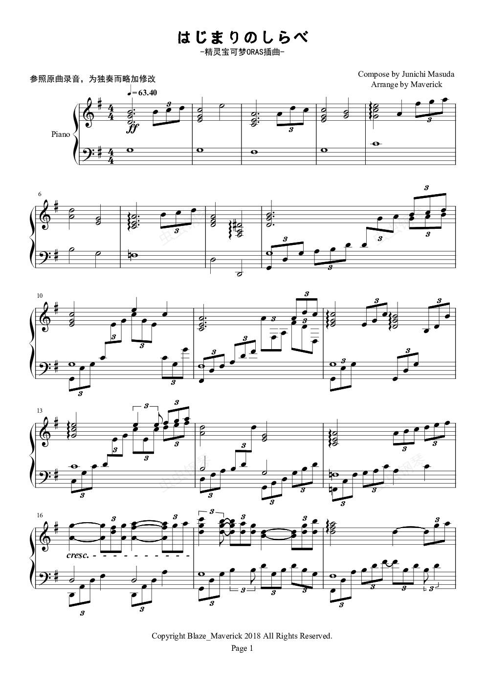 钢琴谱:精灵宝可梦ORAS插曲 はじまりのしらべ