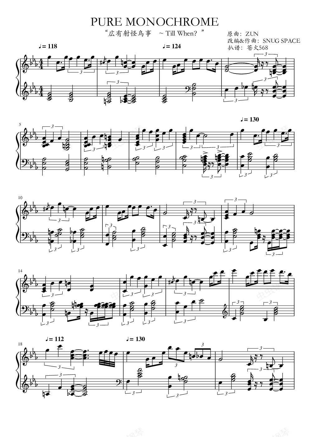 曲名:PURE 所属专辑:CALL ME AGAIN! 作者:SNUG SPACE 这首曲子是东方的同人音乐原曲为《东方妖妖梦》里五面BOSS魂魄妖梦的主题曲《広有射怪鸟事 ~ Till When?》 该专辑于C80发售偶然在网易云听到的。非常喜欢这首曲子的爵士风 因为是纯钢琴曲所以就把它扒了下来 自己对爵士乐了解比较少 尽个人所能把每个音符的时值都咬对了 右手的三连音和切分音比较多 弹奏时请把握好节奏 这次在试听二放了专辑原曲 请各位用网页登陆试听 曲源来自网易云音乐 希望这份谱子可以帮到各位 [IMG]/pu/2018/4/29/__1149__[/IMG]图片来自专辑CALL ME AGAIN! 的封面 话说扒完了谱子自己弹不出来才是最气的