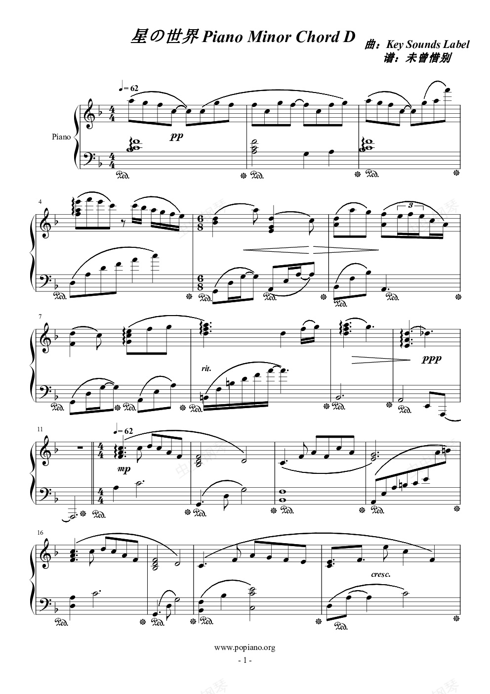 钢琴谱:星の世界 Piano Minor Chord D