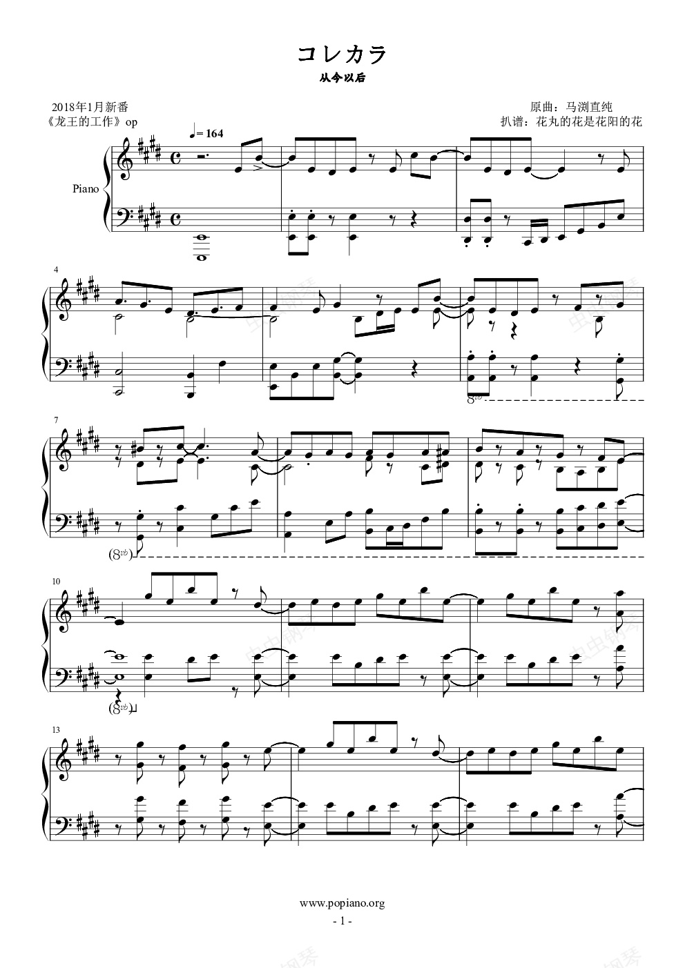 钢琴谱:【一月番】龙王的工作op~コレカラ(从今以后)