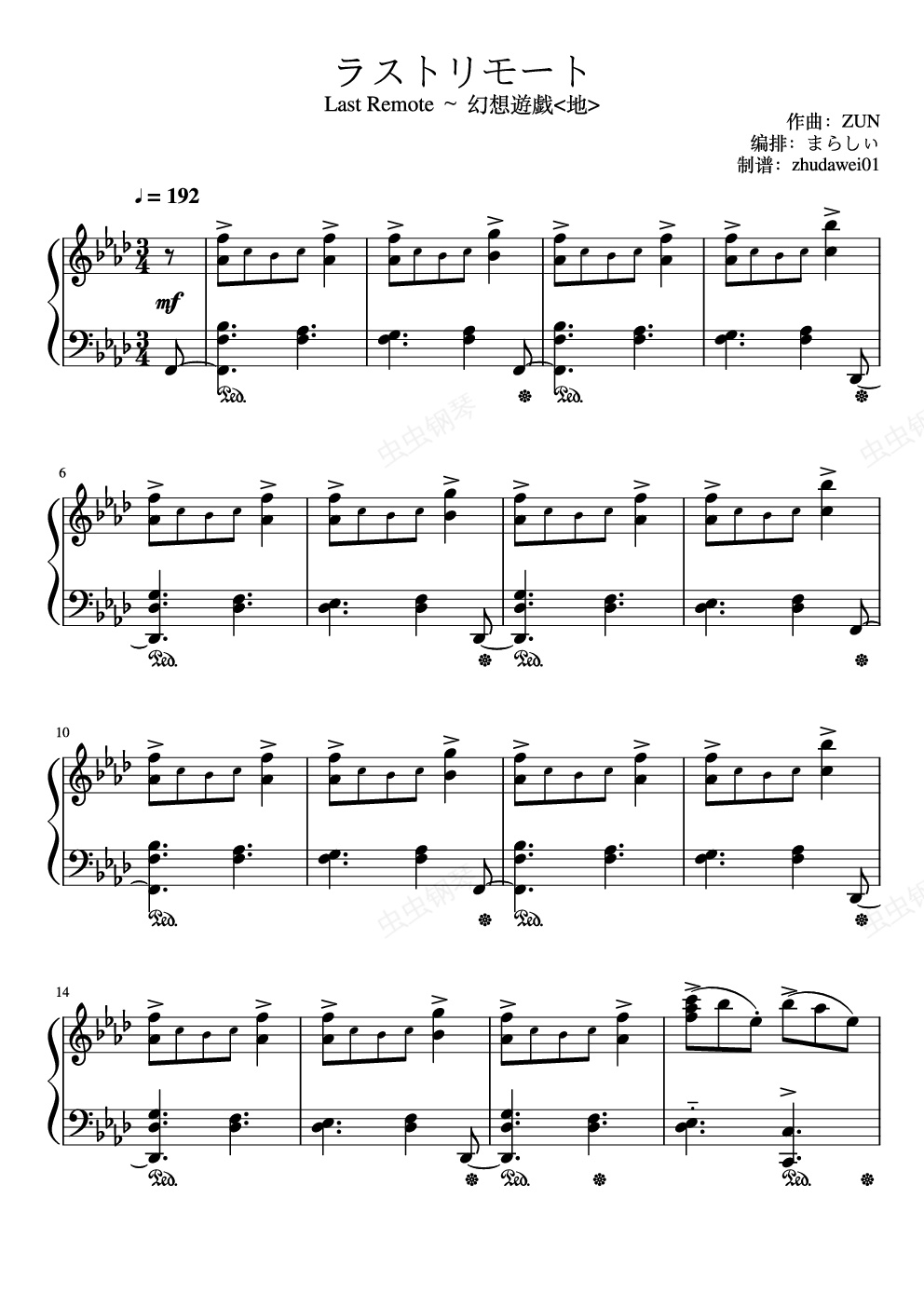 选自《幻想遊戯<地>》,原曲来自《东方地灵殿》。地灵殿EX道中曲,走在守矢神社的路上,感觉心中十分清净。0445前辈我业已弹奏,大体上非常棒,感觉其中的一些细节仍需处理,便自己重新扒了一个。[IMG]/pu/2018/6/18/__8183_94451_[/IMG]图片来自/seiga/========【更新日志】========6/19 谱面与原谱试听优化、增加英文曲名。6/20 修正 18、86节的记号,以及147节倒数三个音符(现在已经改为八度)。同时更新原谱试听以及作品说明。6/29 替换错误使用的音源,修改简介9/17 优化记谱和试听12/25 大幅优化表现效果