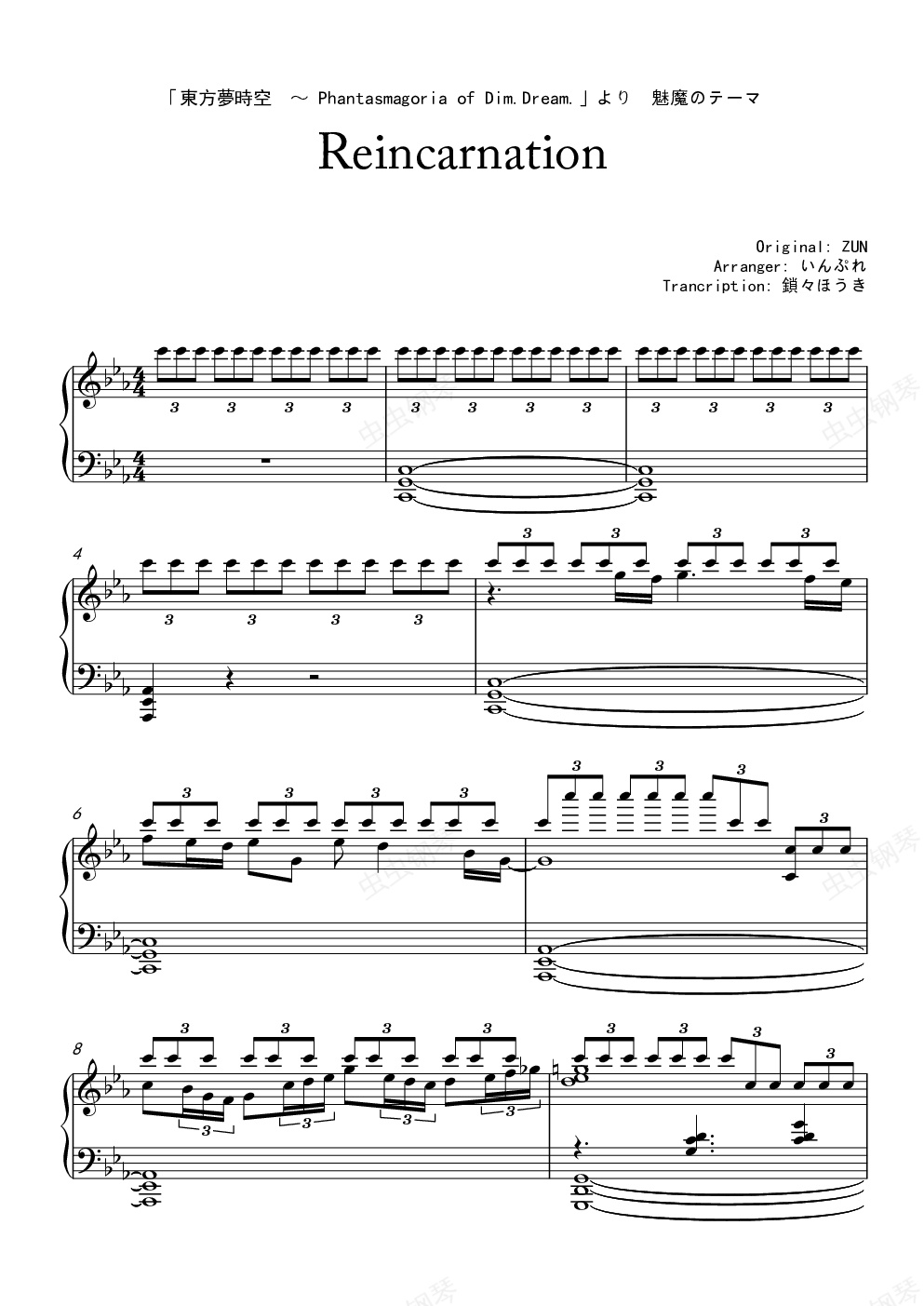 初次見面、請多多關照、吾輩是鎖々ほうき。いんぷれ沒有修改過的曲譜、抄起來真是令人頭疼、之前亂醬抄的明治十七年の上海アリス至少還能看、說多了就是淚、沒想到吾輩居然鴿了這麼久了_(:з」∠)_。譜面吾輩並沒有標註速度(沒錯いんぷれ是沒有標註的)、所以、憑感覺彈吧(完了、要被揍了)、因此、還是給一個參考會比較好。第1小節至第12小節(110)、第13小節至第第52小節(150)、第53小節至第第72小節(140)、第73小節至第第127小節(150)、第128小節至第第136小節(120)、第137小節至第第140小節(140)、第141小節至第第158小節(150)。···嘛、憑個人感覺就好了。試聽只是作為一個參考、畢竟因人而異。哦、對了、這譜對手小的人不是很友好哦(笑)。