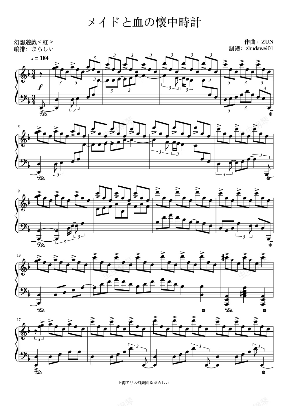 钢琴谱:【东方】【触手猴】メイドと血の懐中時計【幻想游戏<红>】女仆与血之怀表