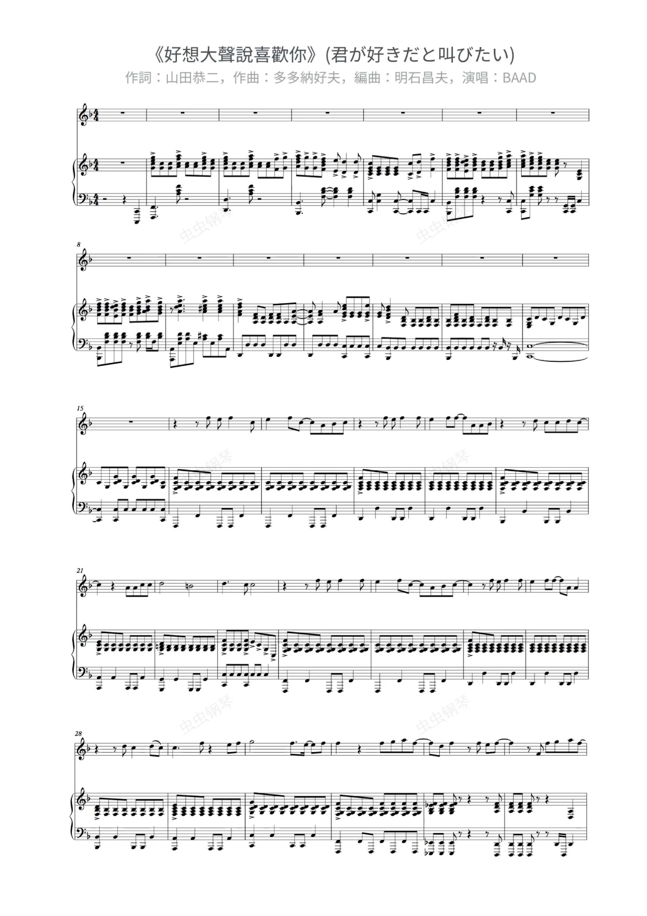 钢琴谱:好想大声说爱你(君が好きだと叫びたい)- 灌篮高手主题曲