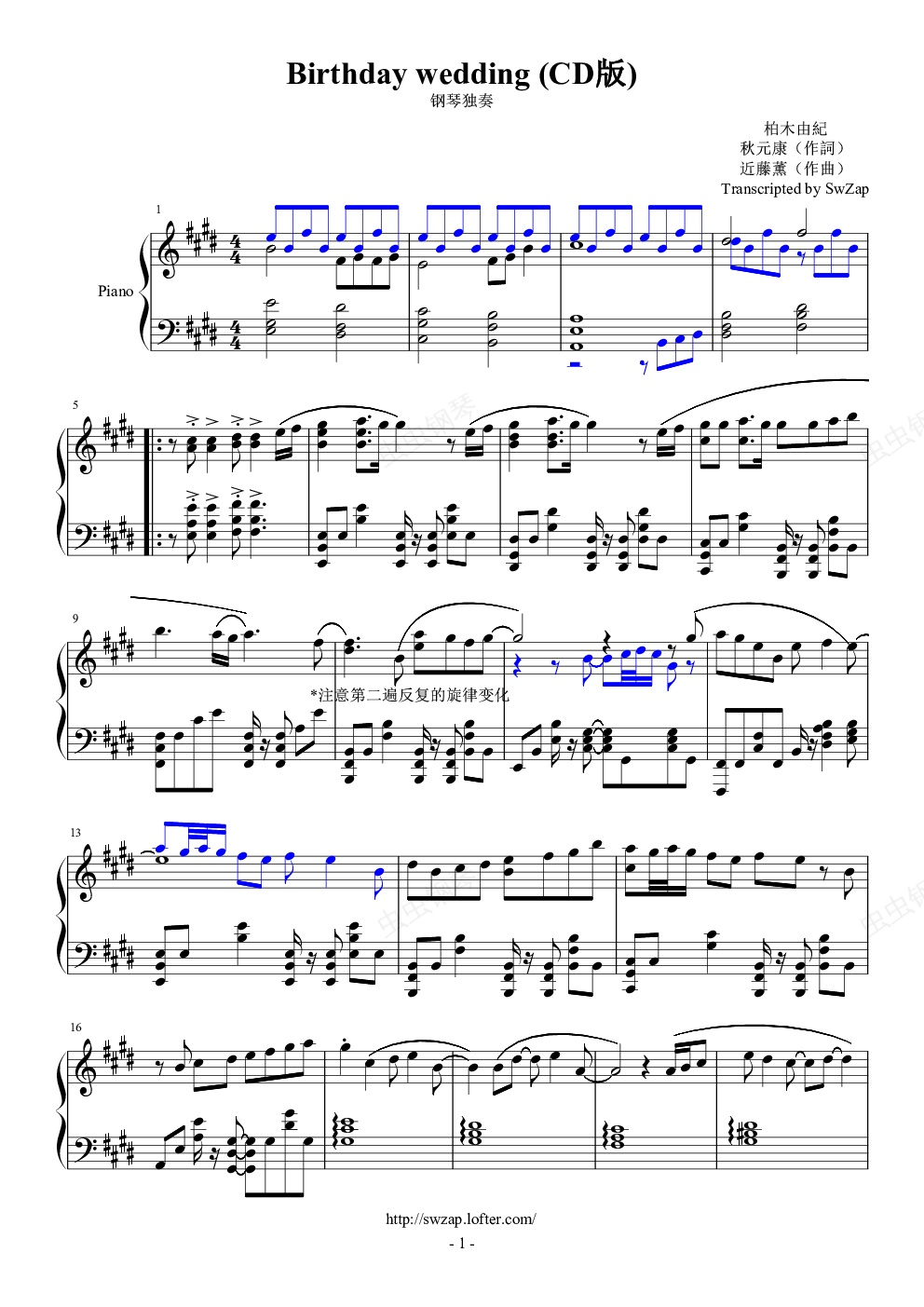 钢琴谱:Birthday Wedding(柏木由纪)