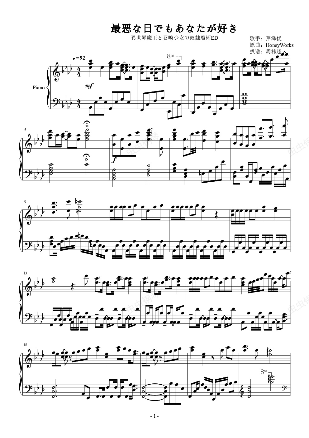 钢琴谱:最悪な日でもあなたが好き[異世界魔王と召喚少女の奴隷魔術ED]