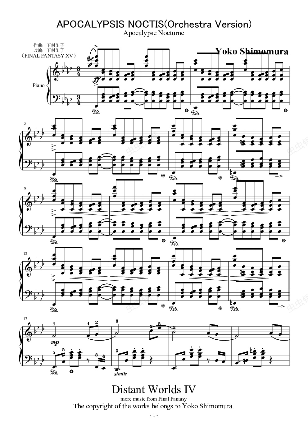 《最终幻想15》(Final XV)主题曲此前有一说法称此歌曲为6/8拍管弦乐合奏曲,这是不符实际的,实际上应该是3/4拍的管弦乐合奏曲()。最后一段加入了唱诗班圣咏。正式的翻译应该叫做“启示录夜曲”。