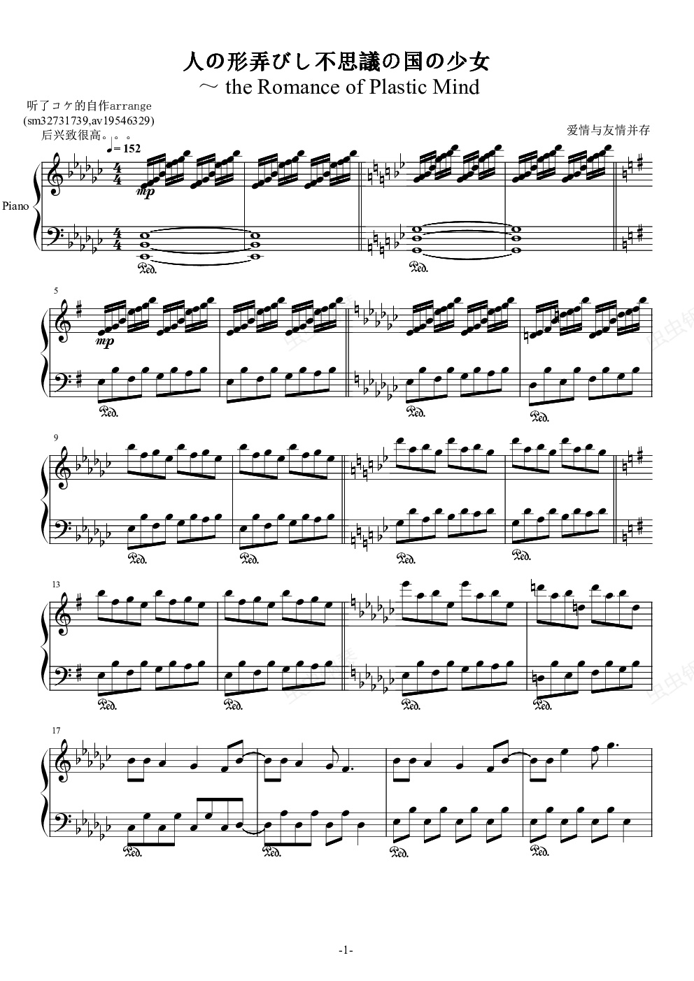 神绮太太我喜欢你女儿啊(误)[IMG]/pu/2018/8/3/__4179_23631_[/IMG]六首曲混,很乱。《人形裁判 ~ 人の形弄びし少女》作主体。17~24小节是《》。25~32小节是《プラスチックマインド》( Mind)。41~48小节是《ブクレシュティの人形師》。49~72小节是《人形裁判 ~ 人の形弄びし少女》与《the of Alice》的混编。73~80小节是《不思議の国のアリス》。85~100小节是《プラスチックマインド》。