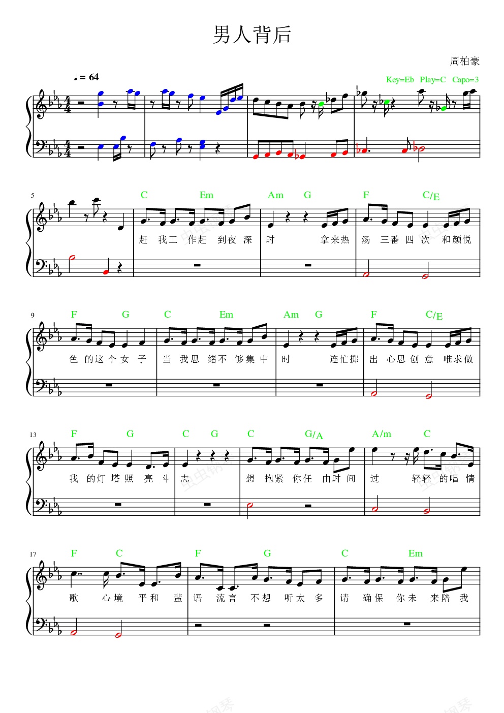 2018年4月16日首发的曲子,总谱我在2018年8月3日首发这次是写的总谱,包括钢琴(蓝色表示),吉他和弦(绿色表示),电贝斯(红色部分),以及演唱的部分以及歌词(黑色表示)。其他的无固定音高打击乐器以及电子模拟乐器没有写出来。因为是第一次制作流行音乐的乐谱,难免有疏漏之处,还请各位看官指点批评。另外喜欢的话也可以打赏一下我哟,毕竟做这个也不容易(不强制要求,自觉自愿)喜欢音乐的爱好者们请加QQ群