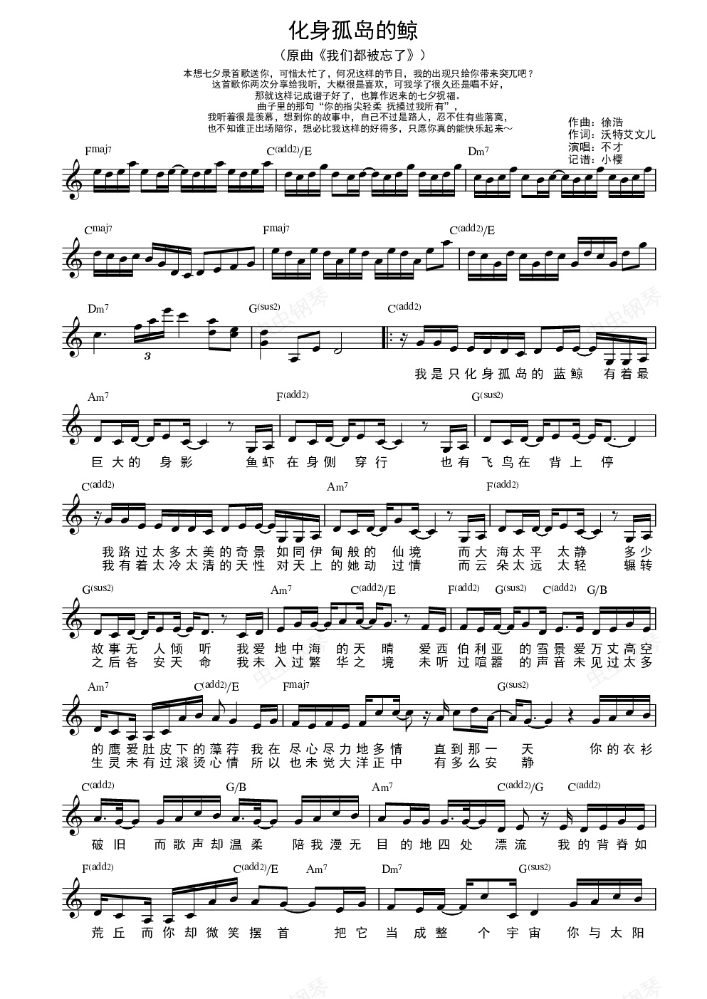 钢琴谱:化身孤岛的鲸