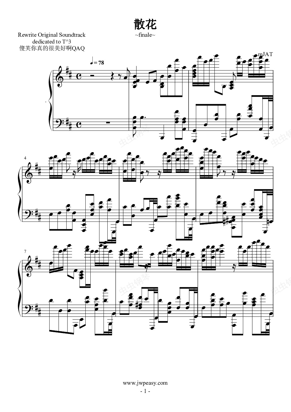 【mJAT】水月陵-散花很凄美华丽的曲子。这首谱子融入了我的全部感情;这次带来的是它的移调版本。在全还原的同时增设了一个装饰声部,还有大幅的琶音叙述,是我最得意的作品之一233“所有的等待都会有结果,所有的努力终会有回报——的,这样美好的祝福。”另外给fgo玩家安利橙子的终章翻译!在芙芙那段被这首曲子震撼到了。希望大家喜欢!!技术要求:超远程波音 八度 琶音跑动推荐练习曲 T叔的 sky[IMG]/pu/2018/8/22/__5859_10320_[/IMG]