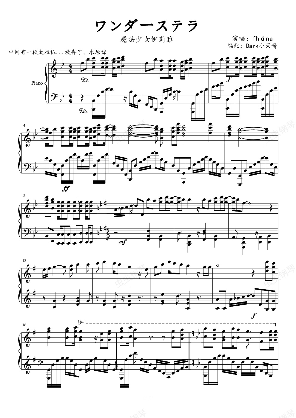 钢琴谱:【魔法少女伊莉雅第三季op】ワンダーステラ