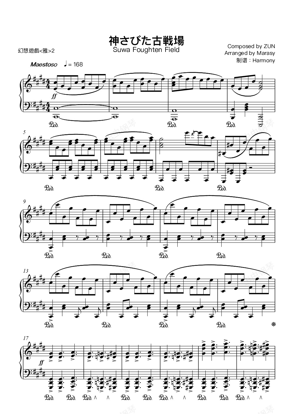 【9.24更新】中秋节快乐!本次更新:谱面更新,试听更新,修正部分错误。希望大家喜欢!大家好,这里和谐酱。今天给大家带来的是猴大《神圣庄严的古战场》在幻想游戏雅2中的版本。该版本较幻想游戏风中的版本简化了不少(猴大放水?)跟其他猴曲比起来简答不少。原曲是《东方风神录》六面boss八坂神奈子的角色曲。谢谢大家。
