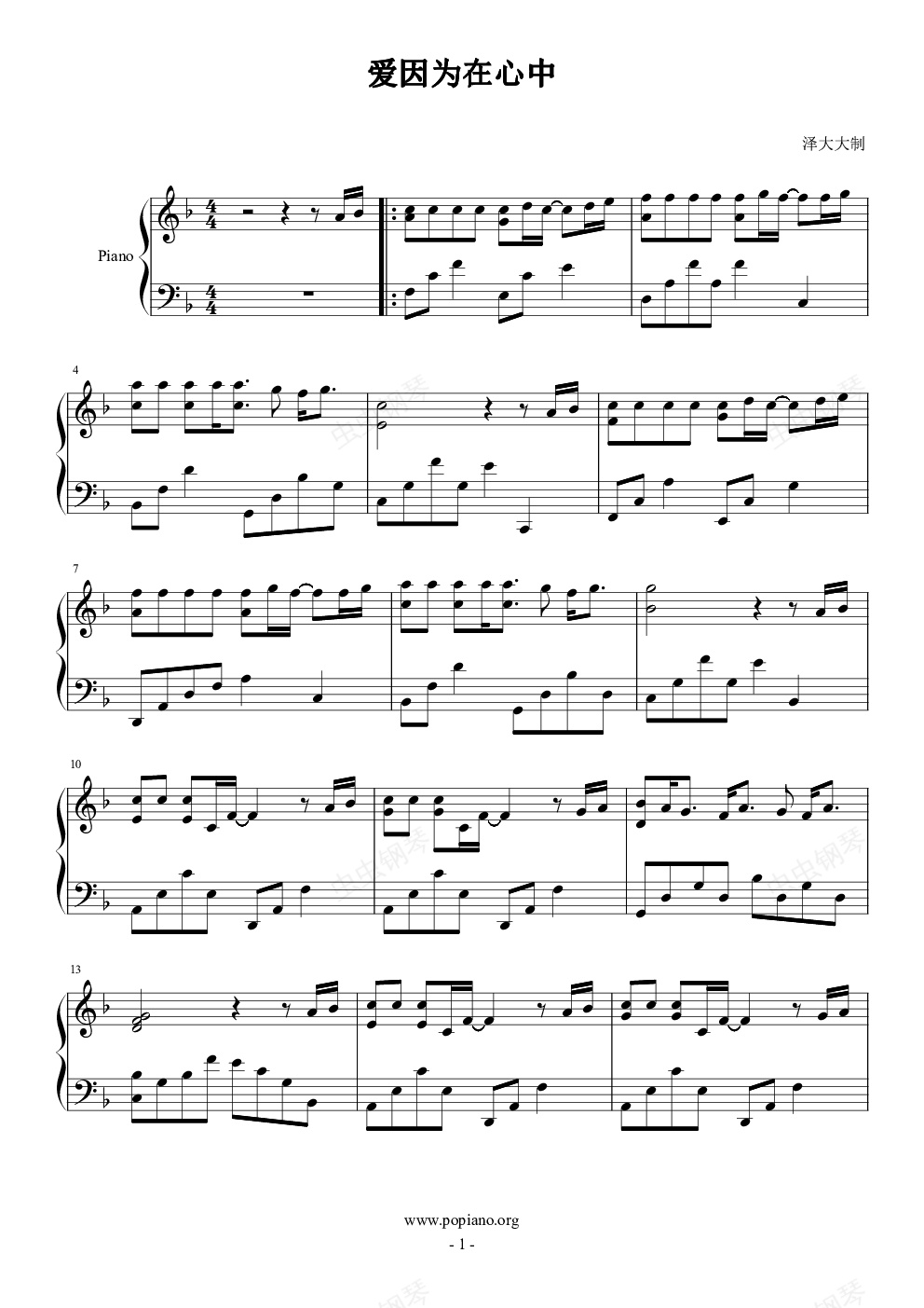 钢琴谱:爱因为在心中(可作背景音乐)