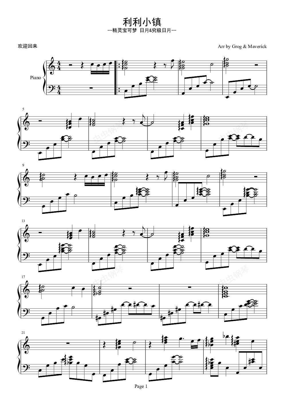 钢琴谱:精灵宝可梦 日月 利利小镇