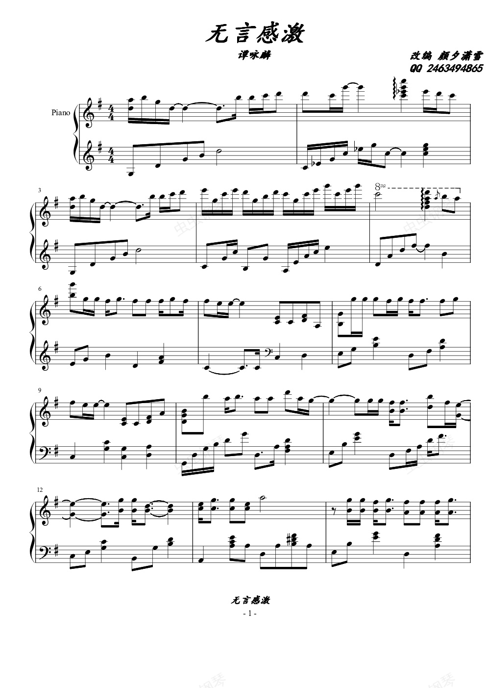 钢琴谱:无言感激【甘仕良版本】