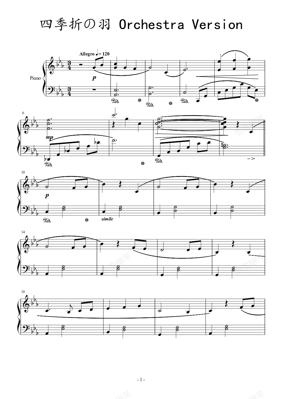 四季折の羽,中文名四季折之羽,动画原版来自动画,由电子歌姬镜音双子演唱,PV动画由PIXIV上的相关人员制作,是一首感动人心的歌曲。主题是日本经典童话鹤的报恩。2018年3月7日,在东京爱乐乐团的初音未来交响乐专辑中,收录有《四季折の羽》的交响乐版本()。这是东京爱乐乐团于2017年在日本大阪举办的交响音乐会上,由日本编曲人岩崎井织以及小岛理改编的版本。不过这首歌听起来,就是坐在大客车里的感觉。舞い落ちる粉雪が 山の背を白く染める 飘然落下的细雪,将山脊染成了白色。寂れた村の あばら家で 在寂静的村庄,简陋的房子中。二人、身を寄せ合う 冬の夜 两个人,在冬天的夜里相偎相依。「出会った日も、雪だった」 あなたが 微笑みつぶやく “相会的那天也是,在下着雪呢” 你微笑着的,在低声说道。囲炉裏火に火照った顔を 大きな袖の影に隠した 将被围炉中的火照的暖暖的脸,藏在大袖子的阴影中。春の訪れを 春天的来临。息吹の歓び さえずる鳥達と 歌う 气息的喜悦,整个鸟儿们在婉转歌唱。「綺麗な声だね」と あなたが言った “声音真好听” 你这样说着。ただそれが、その言葉が、嬉しくて 只是那句,那句话,让我无比欢喜。「いつか、綺麗な声が出なくなっても。それでも、私を愛してくれますか?」 “如果有一天,我再也不能发出这么好听的声音了。就算那样,你还会爱着我吗?”「当たり前だよ」って 優しく笑い 说着“那是当然的了”,你温柔地露出了笑容。そっと 大きな手が頬を撫でた 轻轻地用宽厚的手掌抚摸着我的脸颊。青葉照る 夏の午後 あなたが病に倒れた 绿叶照着,夏天的午后,你因病而倒下。貧しい夫婦暮らしでは あなたを治す薬は 買えない 对于过着贫穷夫妇的日子来说,连能将你康复的良药,也是买不起的。明くる日も 明くる日も 明天也好,后天也好。ただ、ひたすらに機を織る 只有一心一意的在织着布。儚き紅葉の葉のように 就像虚幻的红叶的叶子一样。あなたの命を、散らせはしない 不想让你的生命就此消散。季節は流れて 季节在流转。夏の終わりを告げる鈴虫が リン、と鳴く 宣告着夏天结束的铃虫,发出了“铃”的叫声。「綺麗な指だね」と 傷だらけの手を握る “真漂亮的手指啊”,将满是伤痕的手握住。その手が あまりにも冷たくて 那只手,十分的冰冷。「いつか綺麗な指がなくなっても。それでも私を愛してくれますか?」 “如果有一天,我再也没有漂亮的手指了。就算那样,你还是爱着我吗?”「当たり前だよ」って 咳き込みながら 说着“那是当然的了”,一边还咳嗽着。痛む指を 大きな手が包んだ 宽厚的手掌,将疼痛的手指包住了。昼も夜も 機を織り続けて 白天也好晚上也好,在不断地织着布。早く、早く、薬を買わなければ 快点,快点,如果能买到药的话。もう少し、あと少し、紅葉が散る前に 再一会儿,再一会儿,在红叶落尽之前。この指が止まるまで この羽が、尽きるまで 直到这手指停下为止,直到这羽毛用完为止。嗚呼 落日の風 呜呼,落日的风。无情に朽ちていく実の 无情的将枯朽的果实的。灯火を搖らし 落とす...... 灯火摇动着,吹落了......「いつか、私が人じゃなくなっても。あなたは、私を愛してくれますか?」 “如果有一天,我再也不是人类了。你还会,继续爱着我吗?”怖くて真実は告げられぬまま 因为害怕而一直不敢告知真相。そっと ひとり、最後の羽を折り 轻轻地,一个人,将最后的羽毛折下。「当たり前だよ」って 僕は笑い 说着“那是当然的了”,我们露出了笑容。翼を失くした君を抱きしめ、言った 将失去了翅膀的你紧紧抱住,轻声说着。綺麗に羽ばたいた あの日の鶴を 那一天美丽的羽毛,在展翅高飞的仙鹤。ずっと、今でも覚えているよ 一直,直到今天依然在记着。そして 変わらず君を 愛しているよ...... 然后,我会继续不变的,在深爱着你......注:此前该歌曲也有过中文填词翻唱版本。一个是填词者找她的好友脚脚翻唱的,另一个是另外一位UP主内田小岛做的洛天依以及言和的调教版本。由于原曲后面的部分为镜音双子的合唱,所以我们根据原曲中镜音连的音效改为特殊效果演奏,以达到真正的演奏效果。因此,为了符合演奏要求,必须要用这种交响乐的版本。