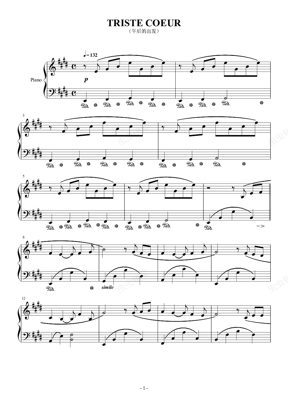 《午后的出发》(英文名 Coeur,源自法语),原名《痛苦的心》,是世界著名的钢琴家——理查德·克莱德曼()演奏的钢琴曲。据说此曲是日本电视台节目《午后赴旅》主题曲,到底哪个名字先取已经无从考察,这首歌旋律很优美,比起感觉到忧伤,不如更像是从悲伤中挣扎出力量,奏出坚强的旋律,不知道有没有表现出这首歌的层次,考虑到时代的发展,该歌曲目前已被更名为《午后的出发》。虽然是以夕阳西下为主题的钢琴曲,但是想表达的是由弱到越来越强的层次,就像悲伤总是会过去,等待并不可怕,因为没有天不会亮的夜晚,所以有人认为,《午后的出发》这个名字是更加贴切的。
