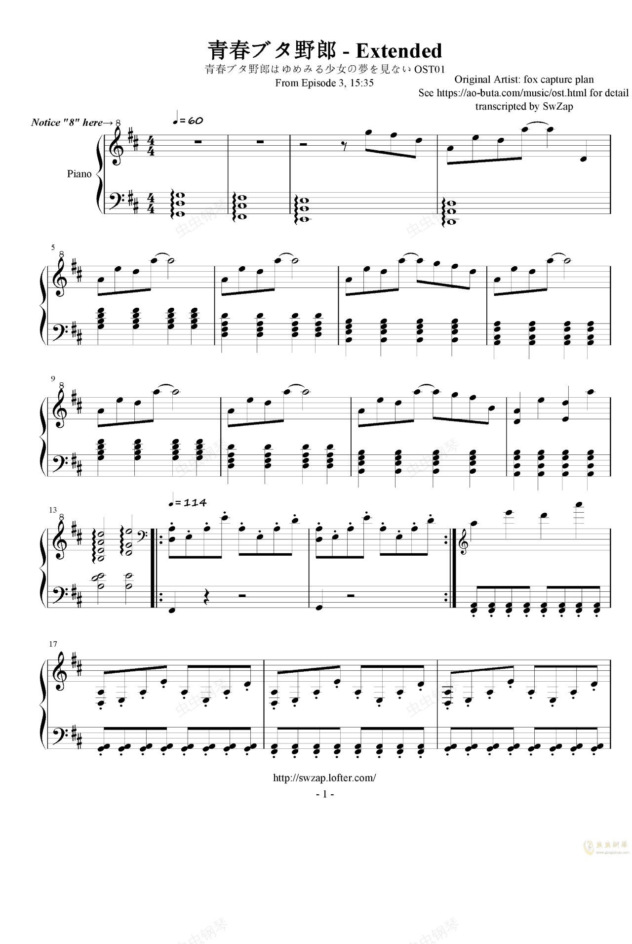 钢琴谱:青春ブタ野郎 (《青春猪头少年不会梦到兔女郎学姐》OST)钢琴独奏