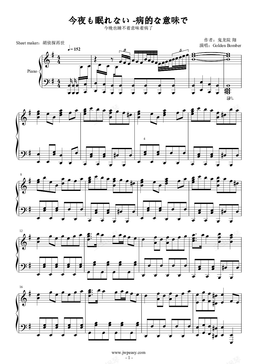 钢琴谱:【金爆】今夜も眠れない -病的な意味で