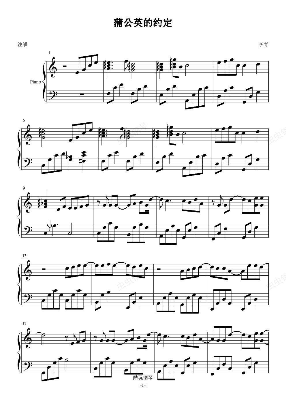 钢琴谱:蒲公英的约定(带钢琴专有伴奏)