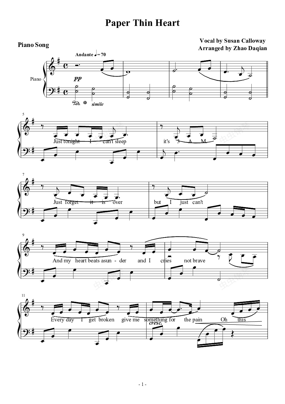 原曲出自《Paper Thin Heart -》,个人根据原曲效果改变成钢琴曲。Just I can't sleep,it's 3 am.今夜辗转难眠,时针指向凌晨三点。Just it is over,but I just can't.现在忘了一切都已经结束了吧,然而我做不到。And my heart beats,and I cries not brave.我的心跳被撕裂着,哭地像个懦夫。Every day I get,give me for the pain.每一天我都支离破碎,能否给我一些东西慰藉我的痛苦。Oh this paper thin heart, in my soul.噢这脆弱的心,浸透在我的灵魂里。I got this paper thin heart,and it's got a hole.我有一颗如此脆弱的心,它早已千疮百孔。Oh my paper thin heart,tell me you won't let me go.噢我脆弱的心啊,告诉我你不会让我离去。Cause I'm paper thin.因为我是如此的脆弱啊。 for a new world,I just want break.(你)描绘出一个崭新的世界,然而我只想毁灭一切。I'm just so sick of,the same.我已经对再犯相同的错误感到恶心。And I lost all my armor,cause I love you too much.我卸下所有防备,只因爱你至深。Cause now here to be,some so ready to can now.最后却除了灰烬什么都没留下,是时候抛弃一切了。From this paper thin heart, in my soul.这脆弱的心啊,浸透在我的灵魂中。I got this paper thin heart,and it's got a hole.我有一颗如此脆弱的心,它早已满目疮痍。Oh my paper thin heart,tell me you won't let me go.噢我脆弱的心啊,请告诉我你不会让我离去。Cause I'm paper thin.因为我是如此脆弱。Why do I,hurt so much.为何我遍体鳞伤。Tell me gain why it's worth it.请再告诉我一次为何这一切是值得的。Why do I,want so much.为何我如此贪婪。Maybe I just don't it.可能我并不值得这一切。How do we turn,我们如何破镜重圆,how do you fix it when it's.你怎样才能挽回,当它已经支离破碎。You and I want,but you don't~get~this.你和我总是想要一个誓言,但你并没有得到。And my heart beats,and I cries not brave.我的心跳被撕裂着,哭地像个孩子。But I rimer you,then there not feel you thing.但这次我会将你粉碎,这样我就不会感受到你了。Paper thin heart, in my soul.脆弱的心啊,浸透在我的灵魂中。I got this paper thin heart,and it's got a hole.我有一颗脆弱的心,它早已残破不堪。Oh my paper thin heart,tell me you won't let me go.噢我脆弱的心啊,请告诉我你不会让我离去。Cause I'm paper thin,oh yes I'm paper.因为我是如此脆弱,噢是的我是如此脆弱。Paper thin heart, in my soul.脆弱的心,浸透在我的灵魂里。I go