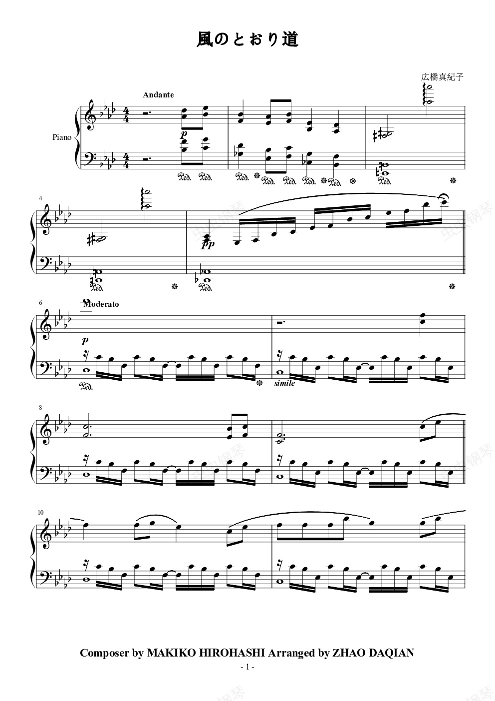 广桥真纪子,日本著名钢琴演奏家、作曲家。出生于日本新鸿县长冈市,毕业于国立音乐大学作曲专业。  5岁开始弹奏钢琴。  非常讨厌读钢琴乐谱。一直制作适当的曲子并弹奏、总是即兴演奏。  这张扬的个性使得她总在正式演出时失败。正式演出后总在后台哭泣。曾经被说成不适合成为演奏家。  之后考入音乐大学其中大病5个月,康复后明白自己的不足,至此走上正道。  毕业后制作了无数的歌曲提供给偶像、歌手。因缘巧合进入环境音乐研究所,开始制作环境音乐。之后做起了治愈系音乐。
