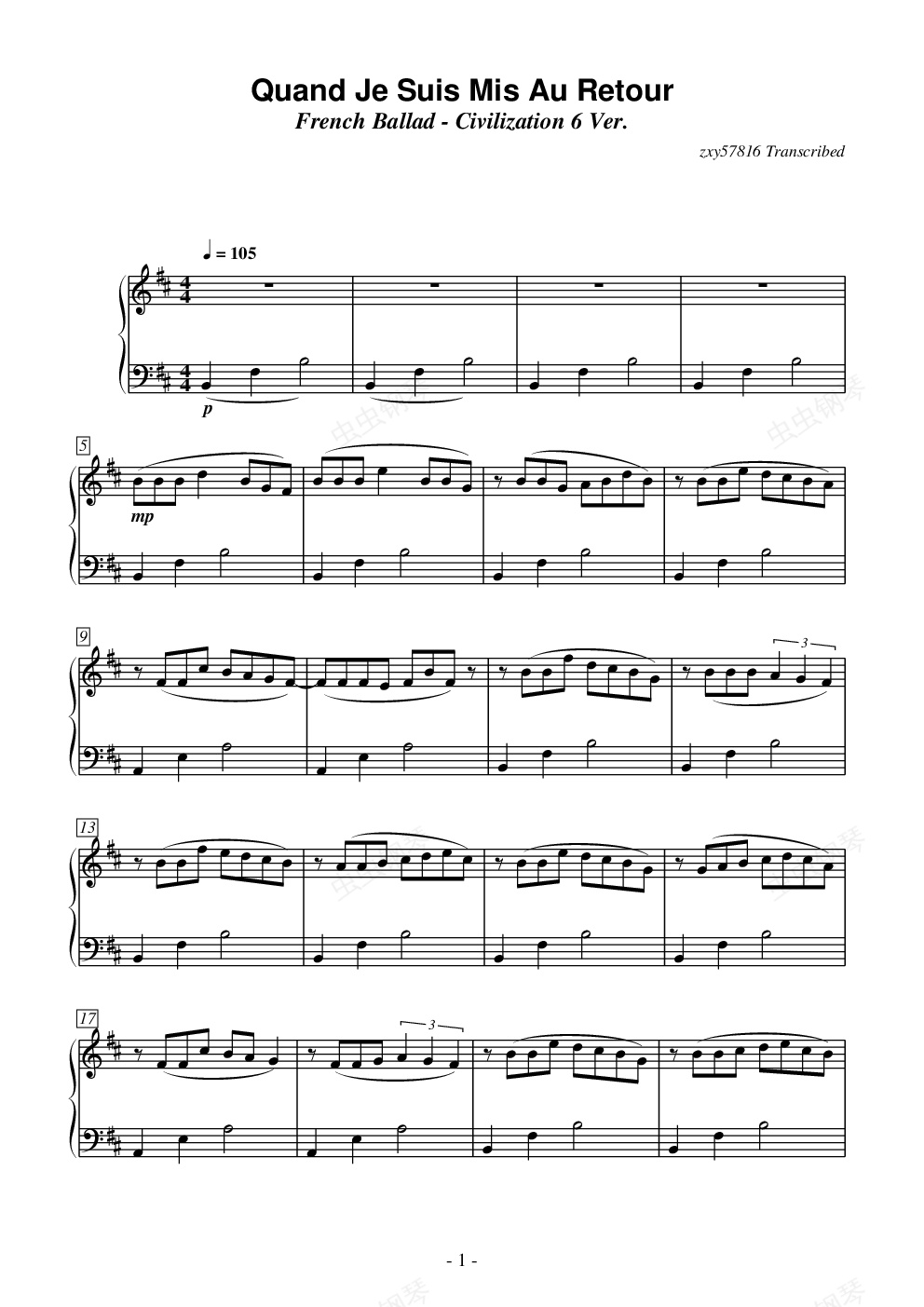 钢琴谱:文明6法国古典时代BGM - Quand Je Suis Mis Au Retour