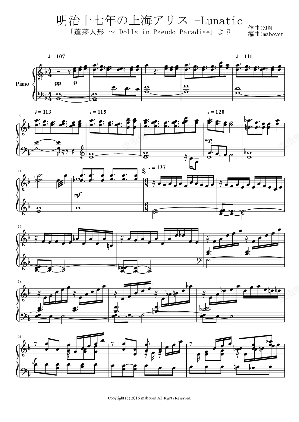 钢琴谱:【东方project】明治十七年的上海爱丽丝