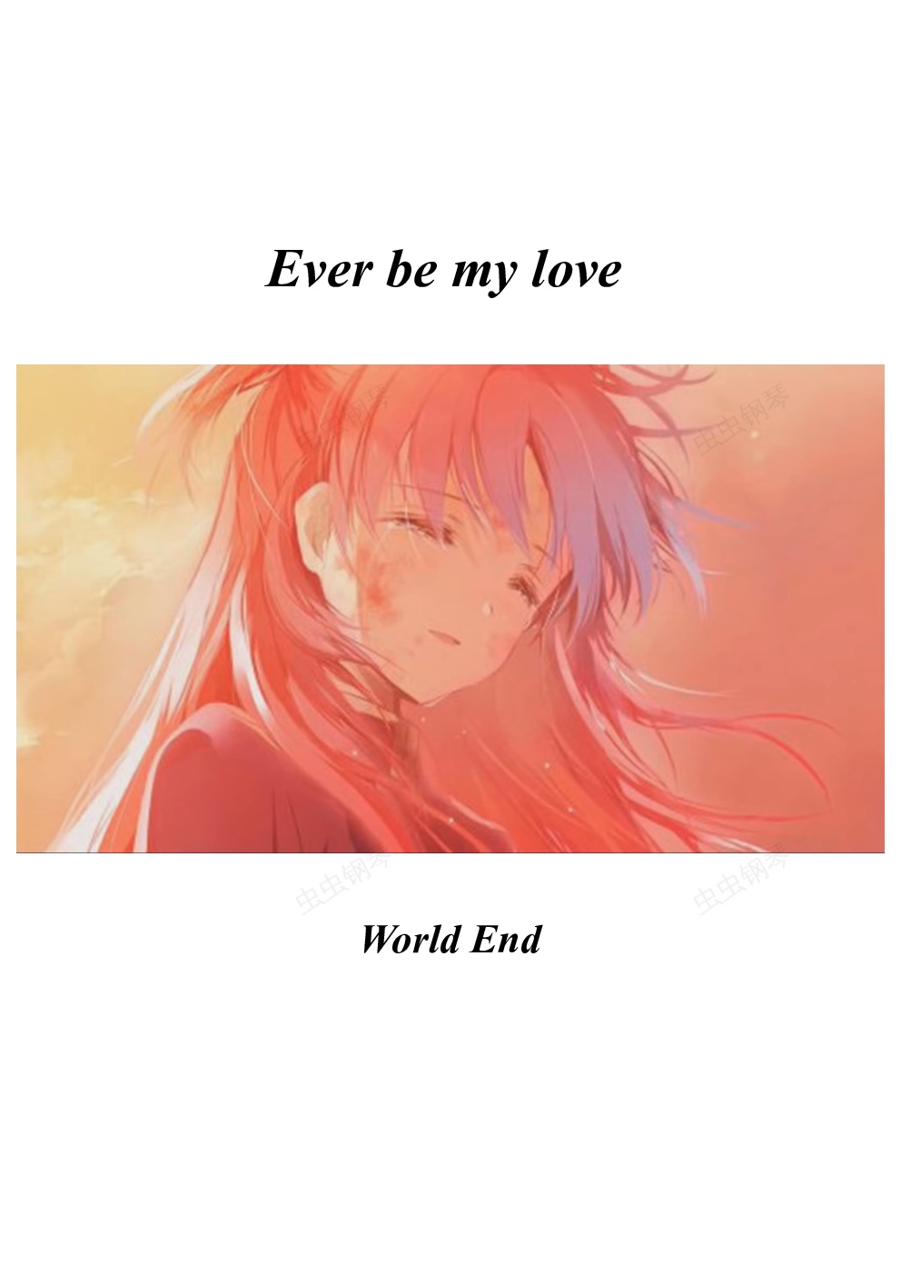 Hi大家,从上一次的最后一份谱子之后有很长段时间更新新谱了,现在终于回来了。这次的谱子是楼主最喜欢的一部动漫之一——末日时可以拯救一下吗——的ED。Ever be my love, fair,和 in my heart应该时动漫里楼主最喜欢的几首曲子了。它们已经感动楼主无数次了,尤其是 fair和 in my heart——这两首在动漫高潮出现的曲子。介于 fair已经是经典曲目了,于是楼主不打算作其编配了,此次更新之后下一首更新为 in my heart。最后说一下此次编配:这次的编配是一次高还原编配,几乎没有加楼主自己的部分。谱子对手速不会有什么难度,但Ever be my love的声部是我至今为止遇到的最多的,于是对左右手的合理分配有很大要求。如果觉得有部分区域很难进展,可以选择性丢掉附属声部。温馨提示:有10度音,跨度不够的话可以舍弃主音保留和弦或交给另一只手合理分配。那么就是这样了,下次见。