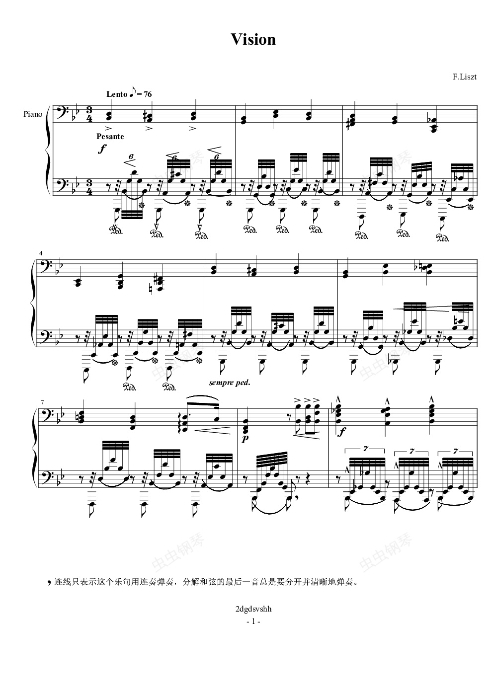 之前我因为虫虫钢琴网没有这首谱子打了这个谱。下面是谱子的其他注解,有部分注解是在谱子里面的,但这些注解不是我本人写的。是在我谱子书里面的注解。我把注释在这里写出来: 第1小节:在这首作品的开头,李斯特在细致、准确并充分的考虑后,指出力度和各声部的关系。右手的音符由于其所在音域的位置已有相应的强调,除此以外,李斯特再标出强调记号,而在不加重的左手低音八分音符上,李斯特还给予 (特别强调)标记,最后他还在具有波浪形的中声部中放置了一个小的渐强记号,所有这些因素造成一个带有八度音的旋律突出的力度高点。认真仔细设计各个声部的区别其目的显然是保证旋律与低音一样有力,而琶音和弦的高点也加强并支持旋律进行的动力。由于渐强的相对性质,所有这些细节甚至在当今都不可能准确的吉普。因此我们在注释中提出这一点。 第8小节:资料来源中 piano (弱奏)的记号只在左手中有,这意味着右手的减弱尚未达到弱奏的程度。 第10小节:我们在右手的最后三个八分音符上添加了强调标记。由于它与第8小节相似,但是我们在低声部的第一个音上没有添加遗漏的 (特别强调)标记,虽然在相同的乐段——第12小节——第一个低音上这个标记是有的,我们之所以这样做的理由是为了随后出现的突然转调——eb小调~D大调的意料之外的解决——制造一个非常强有力而强大的渐强。 第18小节:米尔斯坦吧琶音的高音(那个音是d)改成了小字一组的e,因为他认为资料来源中小字一组的d音是印刷错误。必须承认八音的八度重叠音这种形式会进一步加强旋律,即便如此,在下一个四分音符上就没有这些重叠音。如果检查第二个和第三个四分音符分解和弦的进一步发展的话,在引进七和弦形成半音变化时区分各个声部似乎是更合乎逻辑的解答方法。而另一种解答方法是一四六和弦作为区分声部的起点,把乐句毫无必要的学究式的分成正规的四分音符。 第26小节:资料来源中只在第一个四分音符末尾右手的和弦用了琶音,以后的版本中在第二个四分音符末尾也加上了琶音,因为他们是类似的,我们也采用了这个标记,然而应该考虑到前两小节之前开始的渐强和渐快在力度和速度两方面都要求从一个四分音符到另外一个四分音符稳定的加强紧张度。从技术上来看,这个琶音要实现是不可能的。右手在拍后弹奏琶音会削弱效果。我们在这里的解决方法是:第一个间隙应当是几乎察觉不到的,第二个闪电般的琶音应当只是暗示一个分解琶音的意图,目的是为了使渐强和渐快的动力不收损害。 第28小节:资料来源中在第一个四分音符上没有强调记号。为了和后面两小节相似,我们指出了是强调的程度必须与第二个四分音符上的特别强调的程度统一。 第31小节:在第6、8、10、12个16分音符上的数七和弦旁的临时记号中都出现了c#音,这个印刷错误每一位编辑都未注意。此处需要的是还原记号。 第35小节:资料来源中遗漏了左手第2、4、6个八分音符前的琶音记号。后来的版本每一次都补上了遗漏的记号直到38小节。我们从音乐素材的发展来考虑,职位36和37小节加上琶音记号。 第37小节:左手第六个八分音符和弦的最高音在资料B中错印为G 第40~42、48~50、64和66~68小节:如通常的感觉所要求的那样,我们在音符上加了附点(译者注:这几小节的英文版的评注与乐谱不符,谱上均未加附点)。 第51小节:在两种资料来源中右手第一个八度都有错音,哪里出现了小字族bъ——小字一组bъ,因此在第三个32分音符小字二组d的前面也有一个降号。第一个八度必须与小字一组dъ——小字二组dъ的模进进行相一致,因此第三个32分音符处的降号是属于小字一组b音前的。 第54小节:我们所记的拍号的改变是根据小节内的时值。 第56小节:资料来源中的渐强和特别强调的标记一级生动的布局都表明分解和弦的最高音和低音要同时弹奏,因此我们把每个由13个音组成的琶音和弦分解成两个组合,它们的时值都相当于一个八分音符,第一组包含六个音,第二组包含七个音。 第57~61小节:左手第一个和弦前的琶音记号是编者增加的,它是有必要的。 第57、59、61、63、65小节:在这几处李斯特省略了四分音符后的休止符,为了使旋律线的结构更清晰。我们加上了这些休止符号。补 充练习六:幻影() 第三小节:左