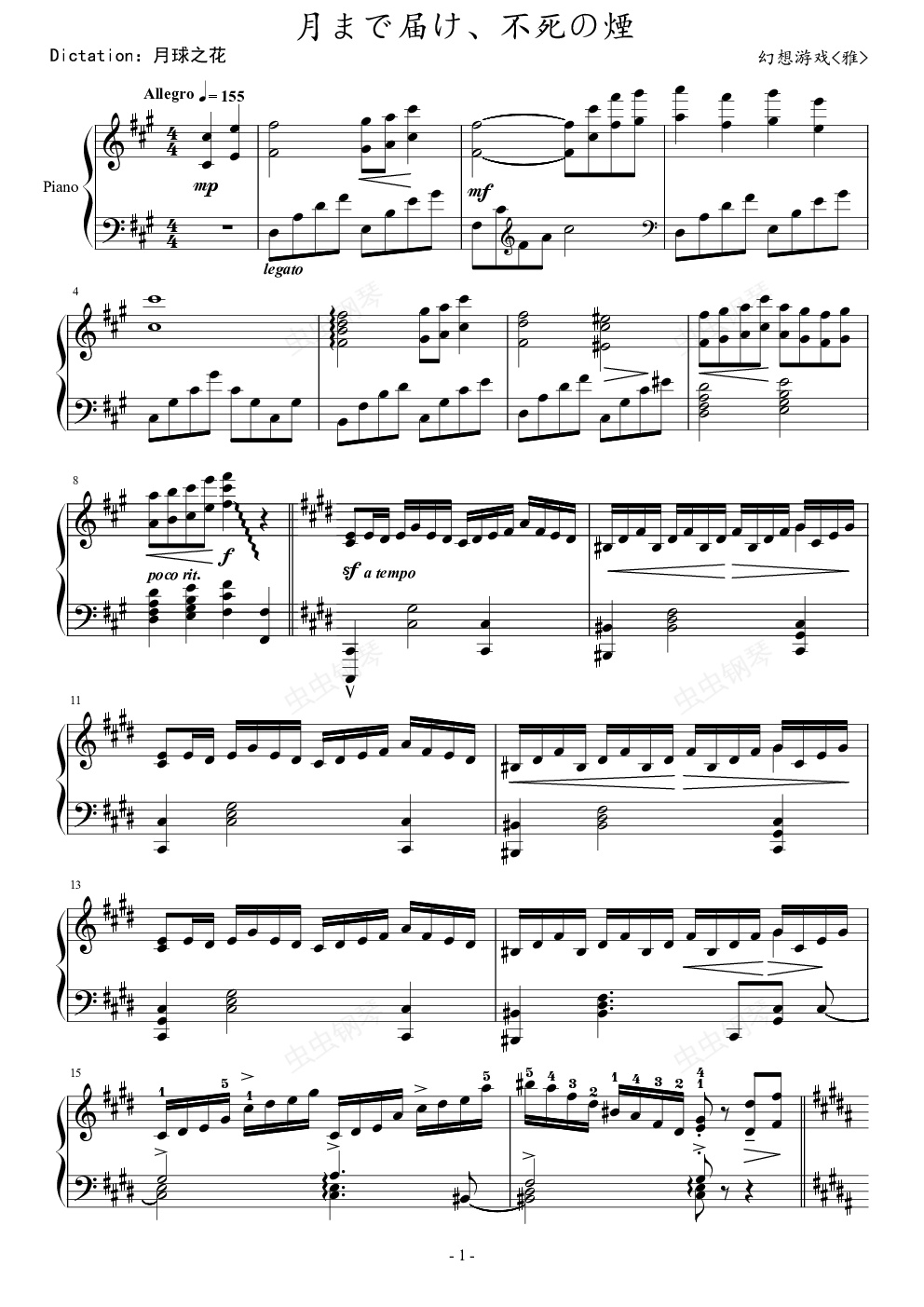 钢琴谱:幻想游戏<雅> 月まで届け、不死の煙