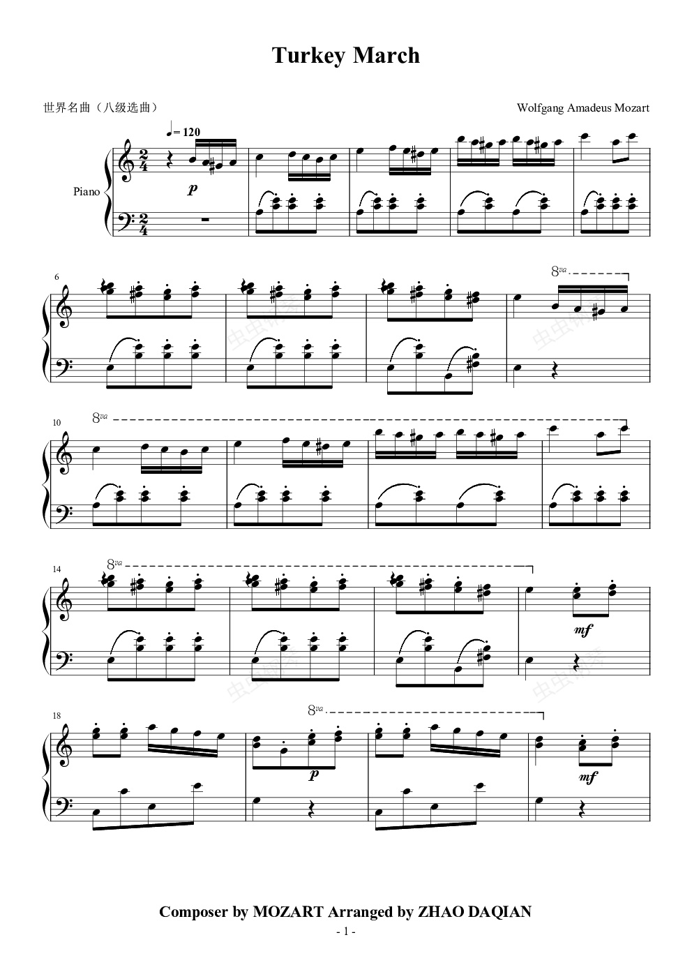 《土耳其进行曲》(英文名 March,一名 March,前者为正式名称),为奥地利音乐家莫扎特(全名:沃尔夫冈·阿玛多伊斯·莫扎特,英文名)的A大调第十一号钢琴奏鸣曲(KV.331)的第三乐章,又称为 Alla Turca(土耳其风回旋曲)。于1781-1783年间在慕尼黑或维也纳所作。莫扎特的《土耳其进行曲》是他的钢琴奏鸣曲——K331的第三乐章。莫扎特共谱写了十九首钢琴奏鸣曲。这些奏鸣曲都显示出明朗乐观的乐思,完美匀称的结构和严谨如歌的旋律等创作特征。《A大调钢琴奏鸣曲》是其中的第十一首,也是最著名的一首。它只有三个乐章,第一乐章是“文雅的行板”,第二乐章是“小步舞曲”,第三乐章就是《土耳其进行曲》。莫扎特的《土耳其进行曲》是一首单独的进行曲小品。本曲全称为《“土耳其进行曲”主题变奏曲》,这是一首以“土耳其进行曲”为主题而驰名世界的变奏曲。实际上,本曲的主题本身并非具有纯正的土耳其风格,正如莫扎特的《土耳其进行曲》一样,只是反映了当时流行的一种“东方风格”,而在现代人看来,本曲几乎没有什么东方味道。但是由于它具有十分通俗而流畅的旋律,故与莫扎特的同名作品齐名,成为不朽的古典小品。乐曲的主题简洁而极其节奏化。八分音符均整一贯的节奏,加上十六分音符来提高活泼感,全曲表现出一种带有童贞般的单纯(片段1)。像这种快活的节奏,在莫扎特的作品中屡见不鲜。各个变奏并不着力渲染技巧,但朴实有力,而又不陷于单调,是一种巧妙的关联。由于我们先前考过此曲,但是被认定为钢琴八级的选曲,至今已经不能再满足我们学习的需求。因此,我们在原曲的基础上,对此曲中的反复部分加入了高八度的记号,成为由中国人改编的土耳其进行曲新版本。