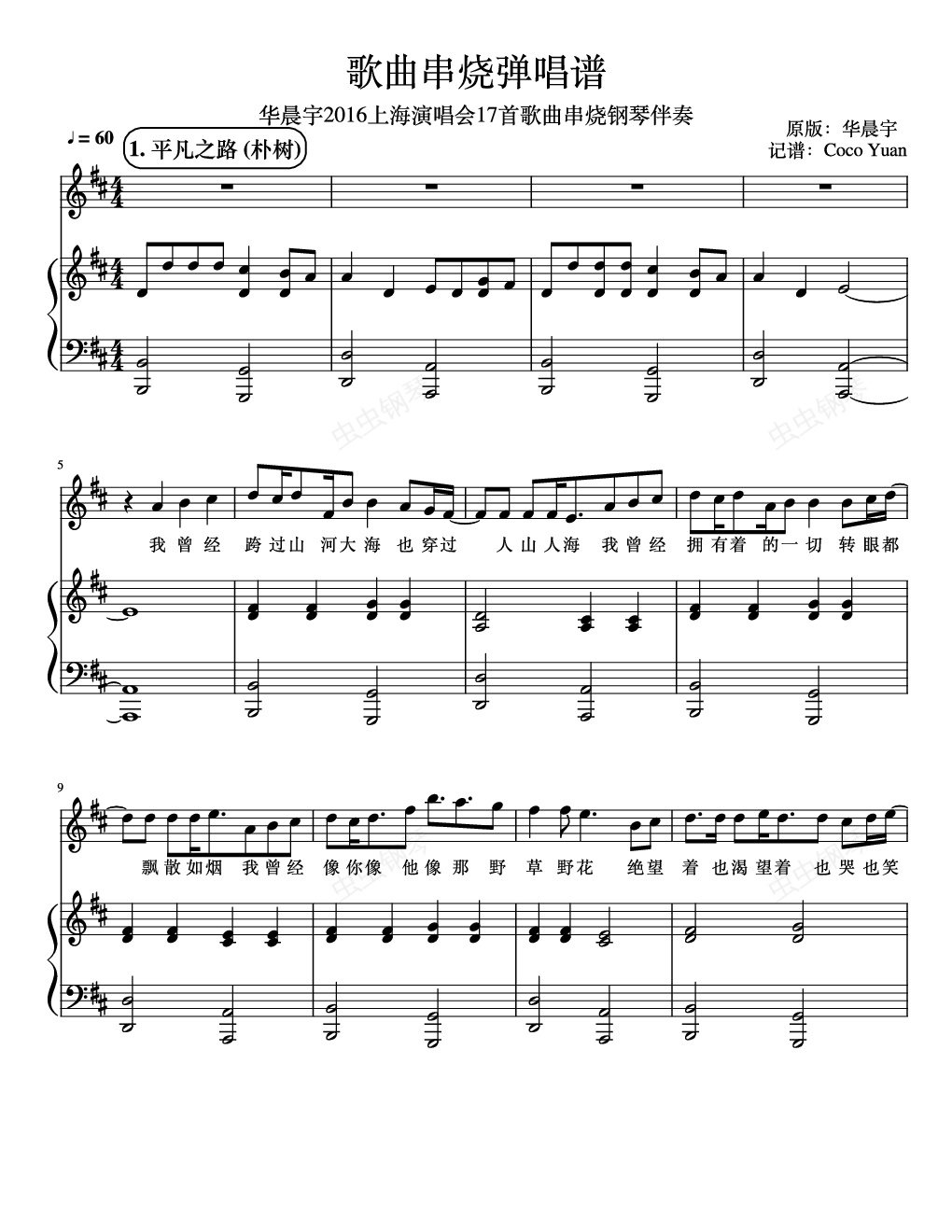其实是16首啦,16年的演唱会串烧弹唱谱,给火火的年终巨献哈哈!也庆祝我阴差阳错终于能在家过个年!开心开心!1. 平凡之路 (朴树) 2. 蜉蝣 3. 环游 4. 晴天 (周杰伦) 5. 世界是个动物园 6. 地球之盐 7. 烟火里的尘埃 8. 爱错 (王力宏) 9. 杀破狼 (JS) 10. 人质 (张惠妹) 11. The Kill (30 To Mars) 12. (Lady Gaga) 13. that I used to know (Gotye &) 14. (Sia) 15. Love the way you lie () 16. See you again ( Puth) 17. 平凡之路 (朴树) 我的微博 @的音乐小圈 欢迎关注