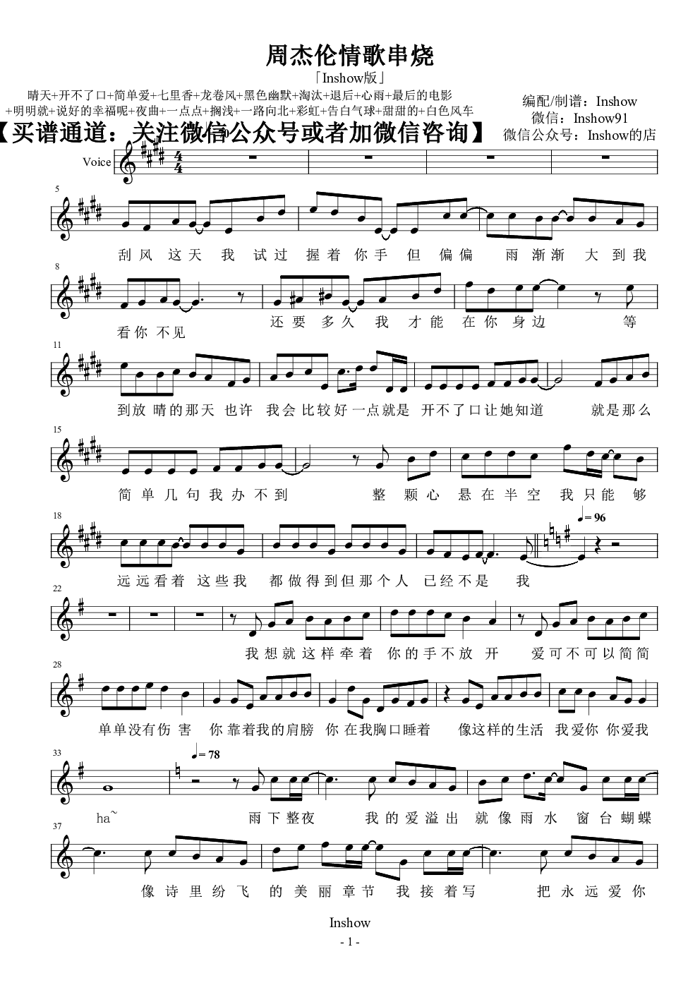 钢琴谱:周杰伦情歌串烧