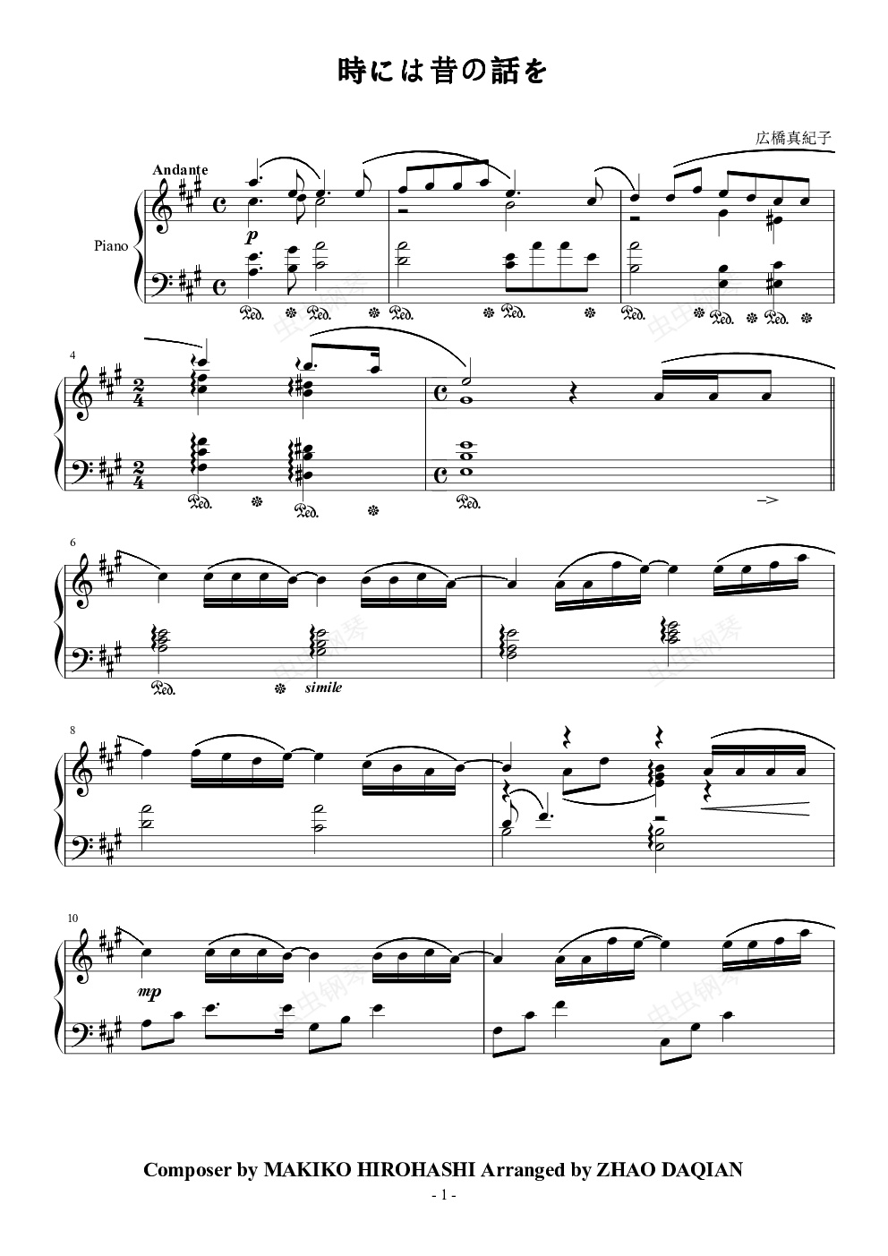 这是一首来自于日本宫崎骏的动画电影——《红猪》(日文名:红の豚,英文名:Porco Rosso)中的主题歌,歌名意思是:偶尔谈论过去的事情,日文罗马音为。不过言简意赅的翻译可以是《往事如烟》。据说该影片改编自宫崎骏的漫画作品《飞行艇时代》,影片主要讲述了被自己诅咒而变成猪的主人公打击空中劫匪,保护身边的人的故事。在影片中,以“波鲁克”为主角为既酷又可爱的猪的形象,但是真正令其出彩的是不屈不挠和勇于献身的性格。由于日本著名的女钢琴家广桥真纪子(日文名:広橋真紀子,英文名)的钢琴版本曾经收录过,但是网上根本找不到该歌曲的谱子,所以我们根据原曲的效果改编成自己的钢琴作品,并增加了一些难度。希望大家能够喜欢!
