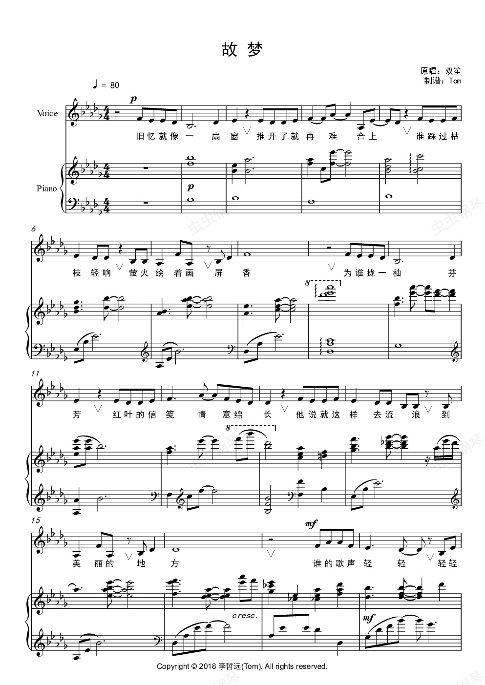 作品说明:本钢琴谱是根据双笙唱的《故梦》制谱的试听1是原谱MIDI,试听2是双笙的原唱如需要免费转调请联系喜欢的朋友可以加下如有改进的地方欢迎在下方评论或者注:版权所有,翻版必究。