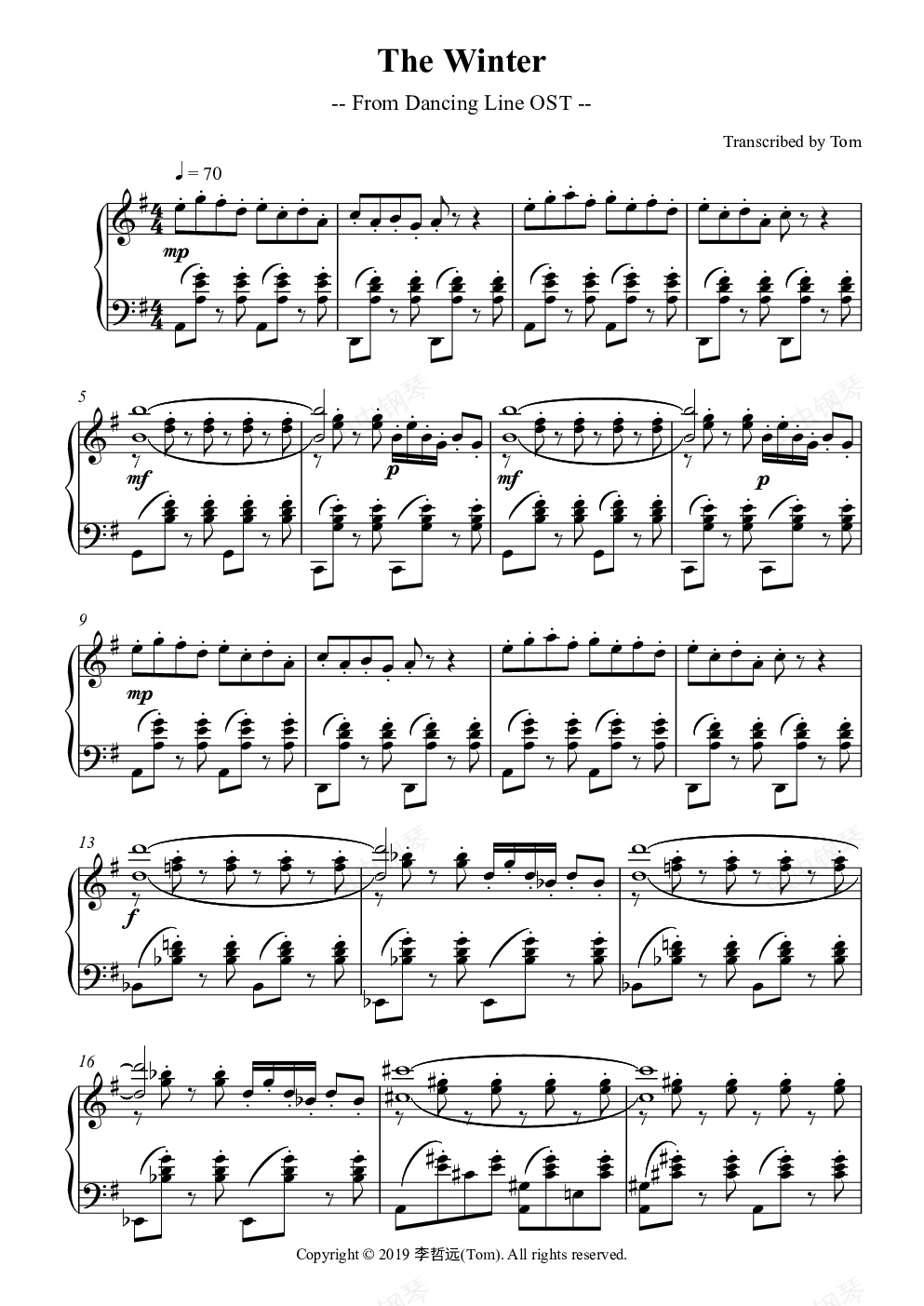 作品说明:本钢琴谱是根据游戏 跳舞的线【寒冬】关卡 改编的试听1是原谱MIDI,试听2是原版MP3喜欢的朋友可以加下如有改进的地方欢迎在下方评论或者注:版权所有,翻版必究。